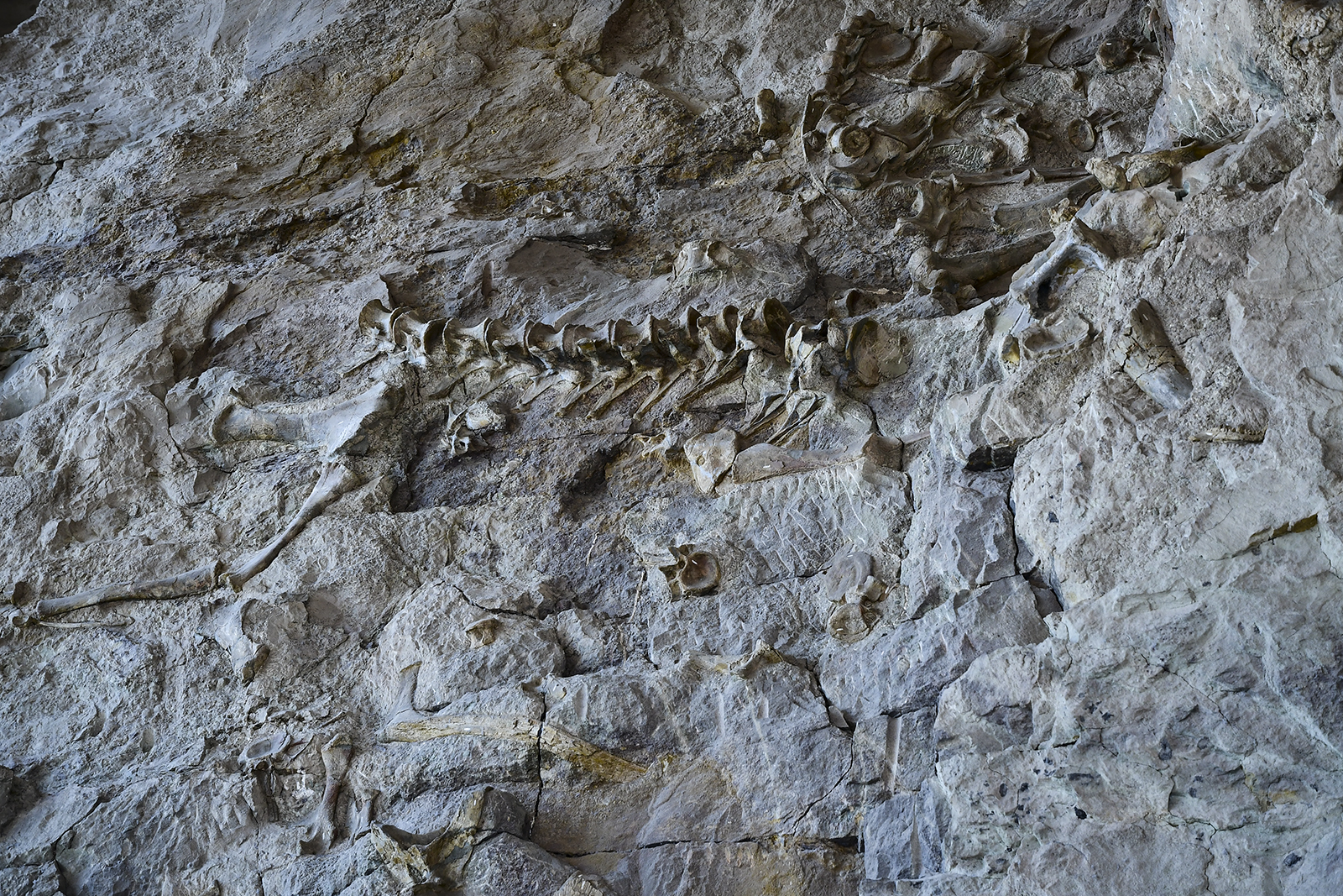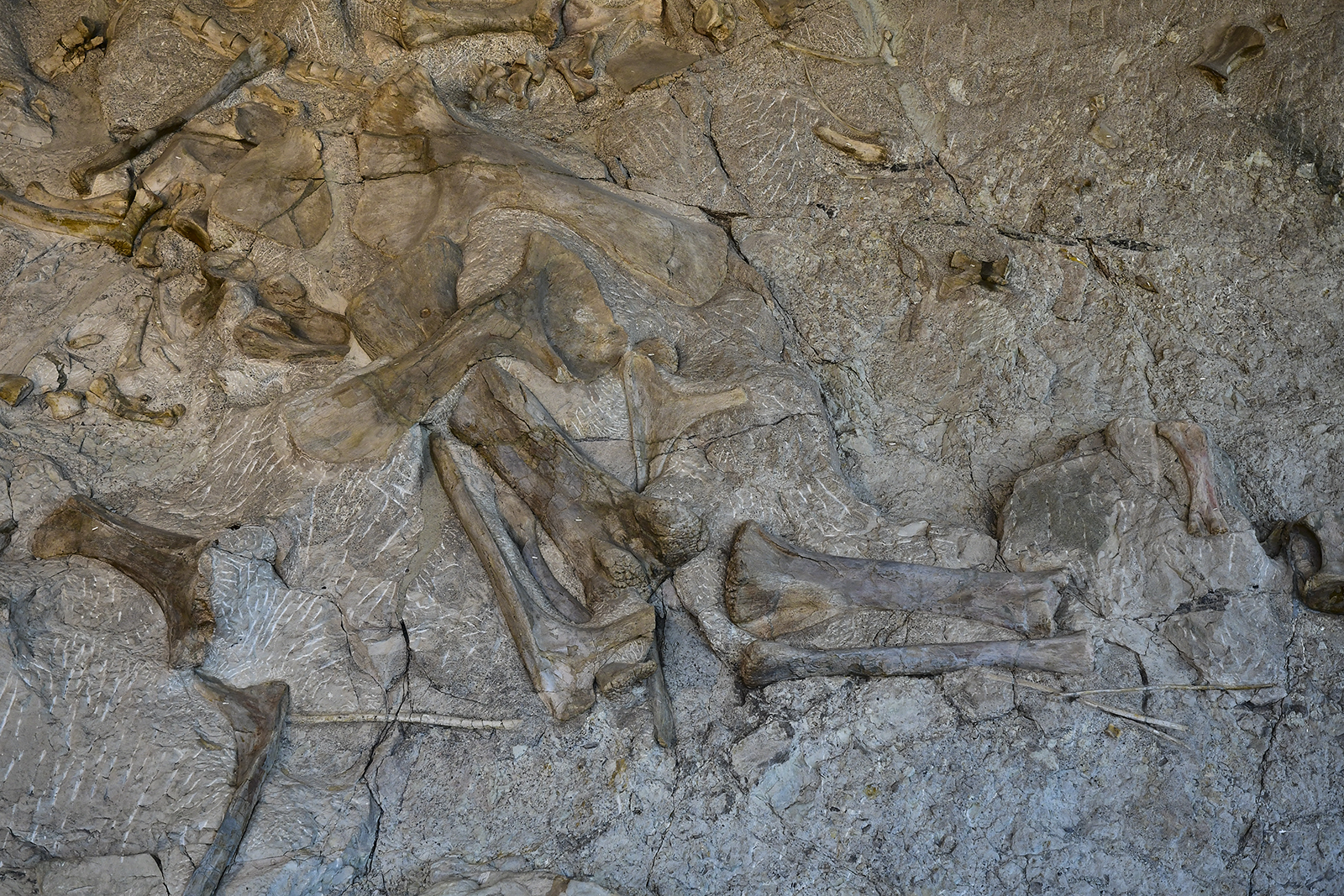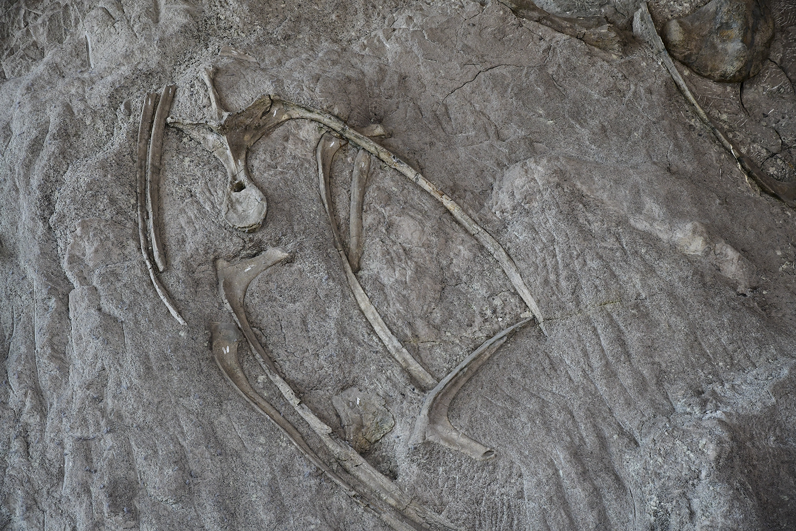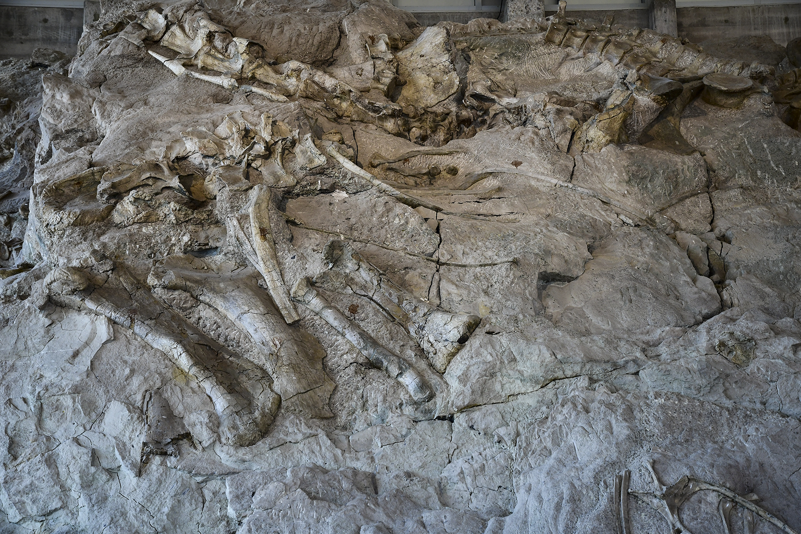 In der Ausstellungshalle ist heute nicht viel los. Die Urlaubszeit der Amerikaner ist vorbei. Die meisten müssen wieder in die Schule oder zur Arbeit. Wir sind fast alleine hier und in einem unbeobachteten Moment schleichen wir uns in eine Ecke der Ausstellung. Hier befindet sich ein riesiger Beinknochen der noch aus dem Fels herausragt.