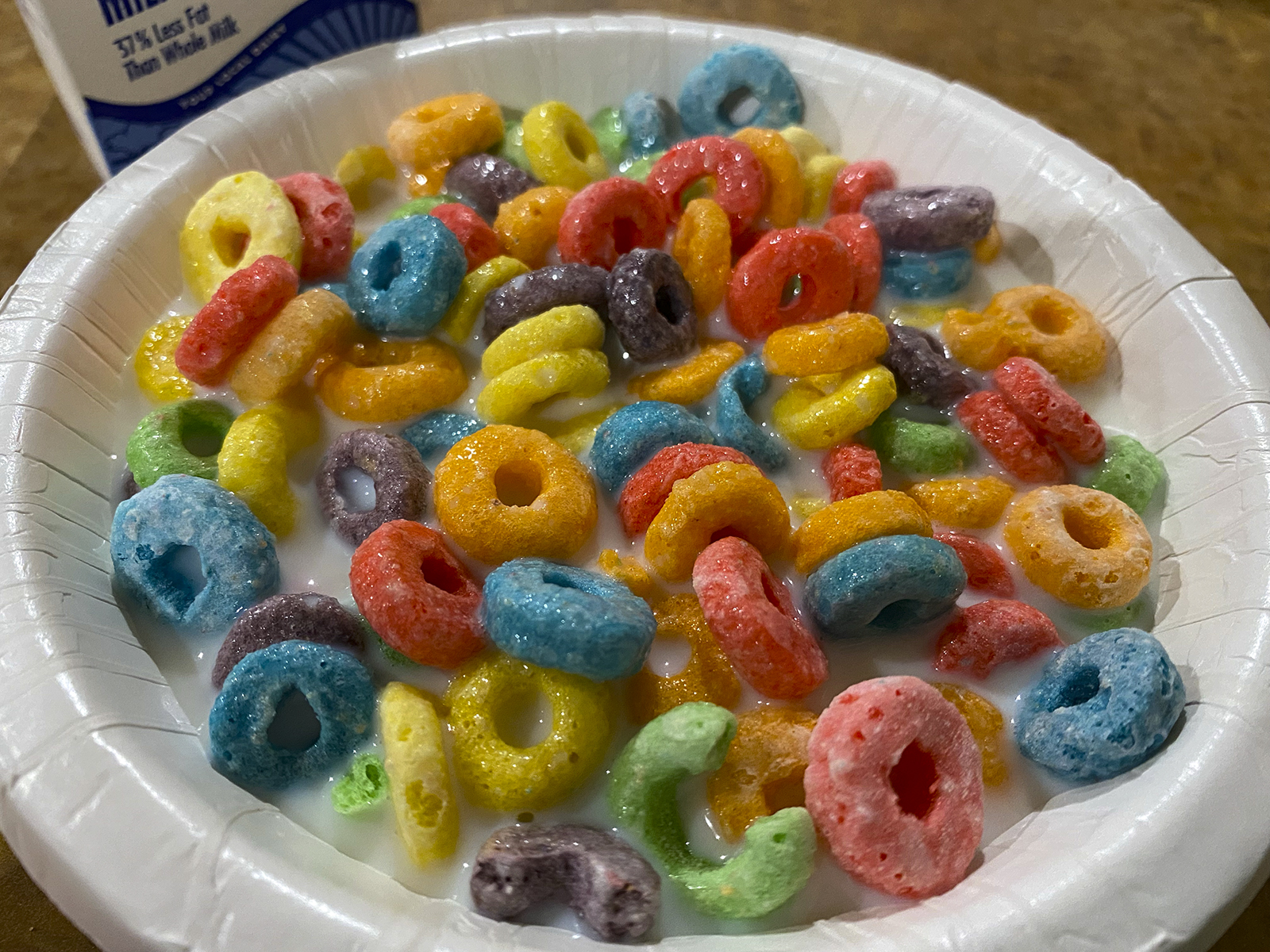 Es gibt eine Art .. hm .. na ja .. sowas wie …ähm … buntes Hundefutter von Frolic – oder so.