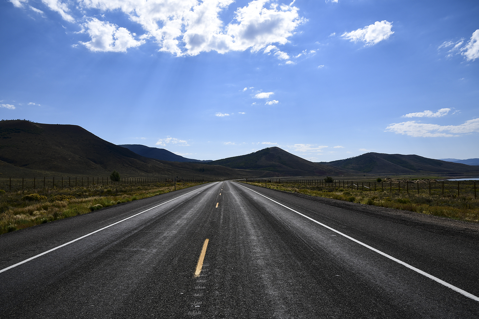 Wie sollte es auch anders sein – es war ein Fehlalarm – bzw. ein anderer Volltrottel von Gast hat um diese Zeit versucht im Zimmer zu kochen. Ich will gar nicht wissen womit und was. Im Zimmer zurück verwandeln wir uns wieder in professionelle Wanderer. Neben viel Wasser und ein paar Müsliriegel wird zur Sicherheit noch das Bärspray eingepackt. Dann geht es los. Wir sind wieder alleine unterwegs in der Wildnis. Es ist noch früh am Morgen und noch sehr kühl. Die Nächte sind hier kalt geworden aber nachdem die Sonne höher steigt klettert das Thermometer wieder schnell über die 40 Grad Marke. Auf dem Highway ist wie meistens hier nichts los. Man kann hier einfach auf der Straße anhalten und Bilder machen. Einsamkeit pur.
