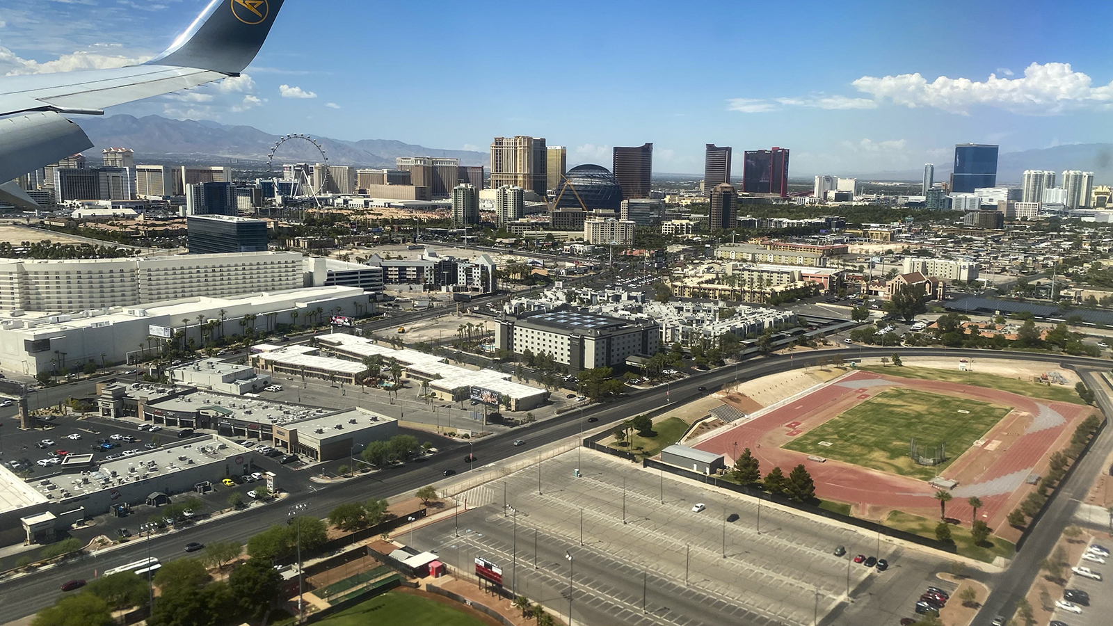 Wir fliegen am berühmten Las Vegas Strip vorbei und setzen auf der Landebahn hart auf.