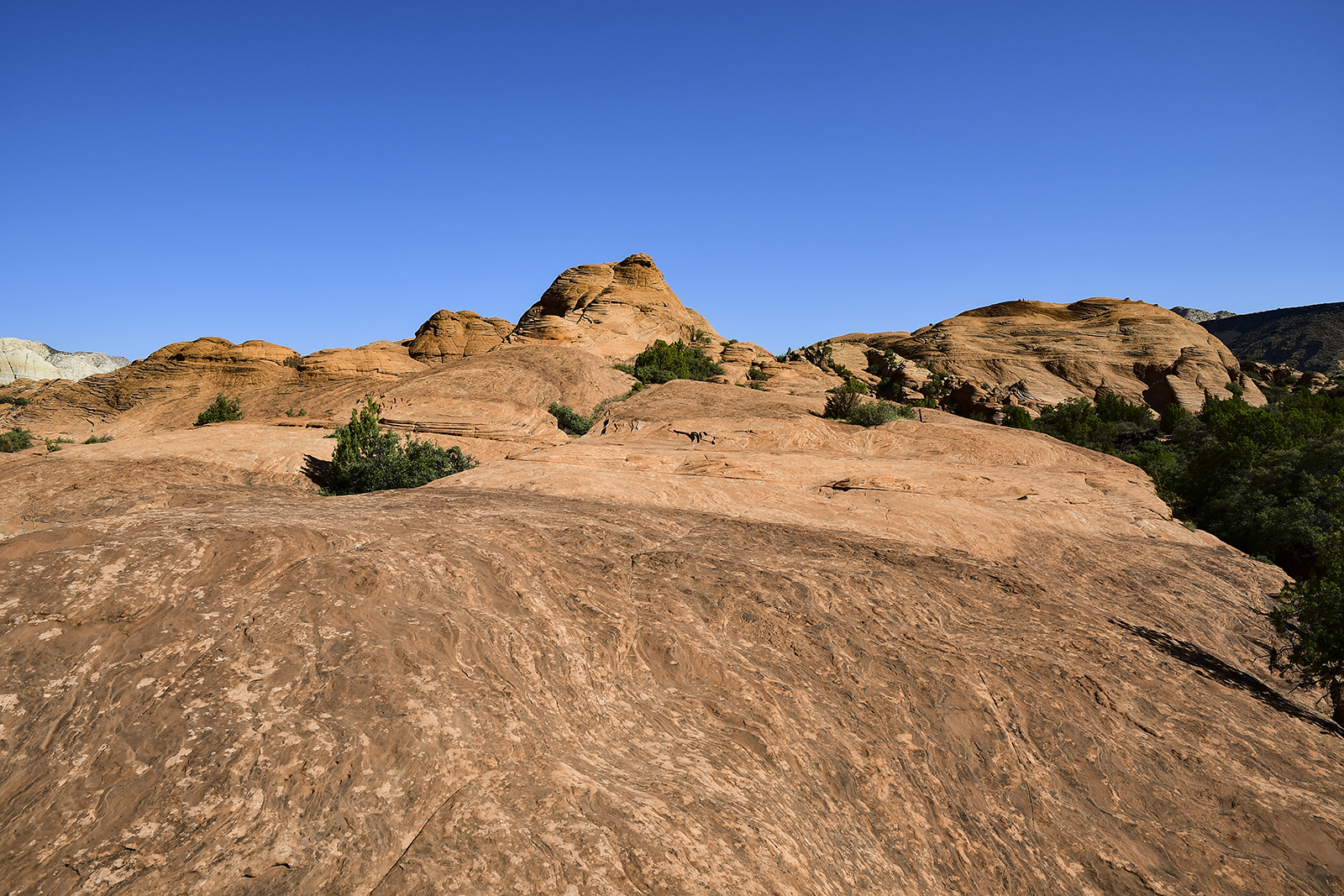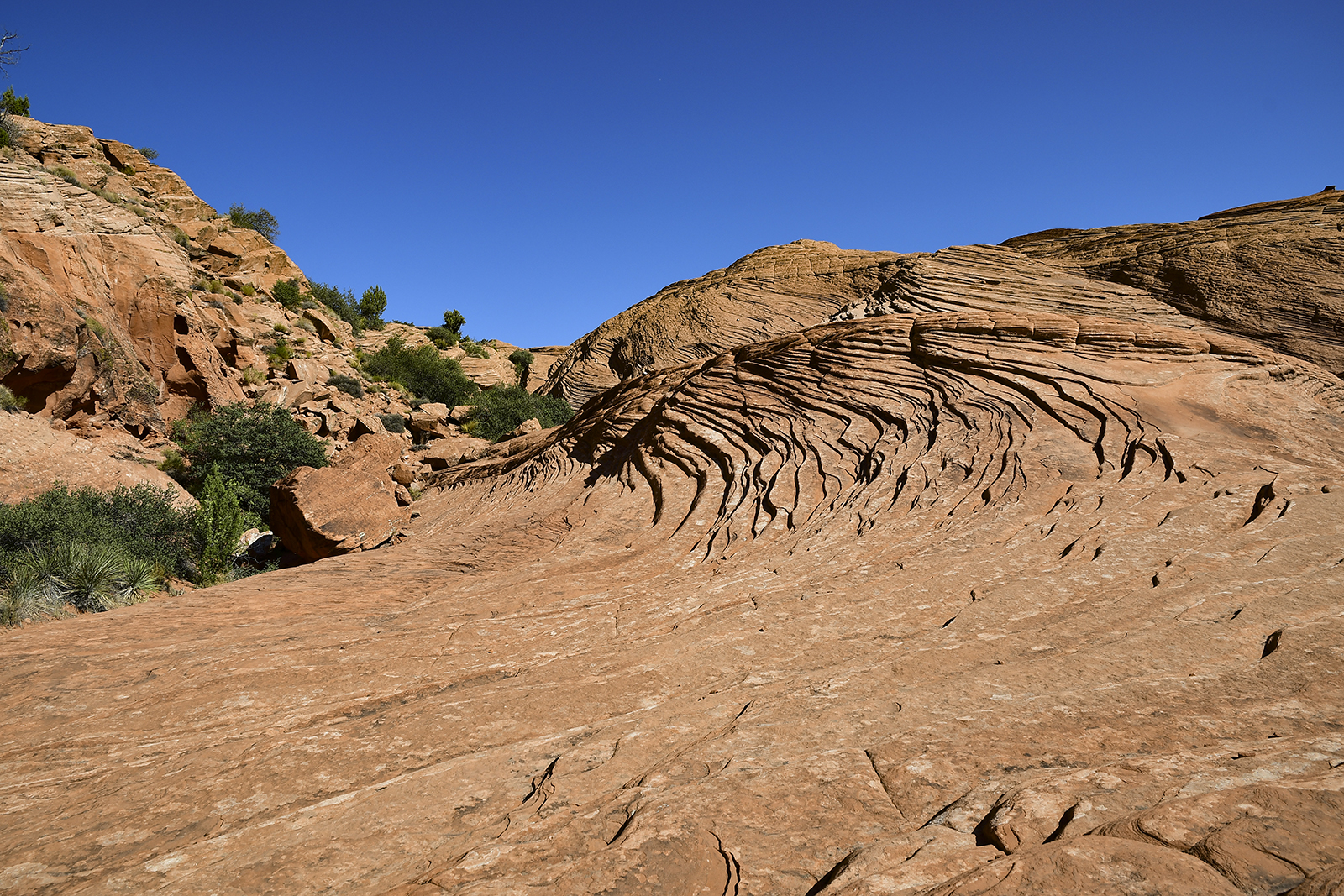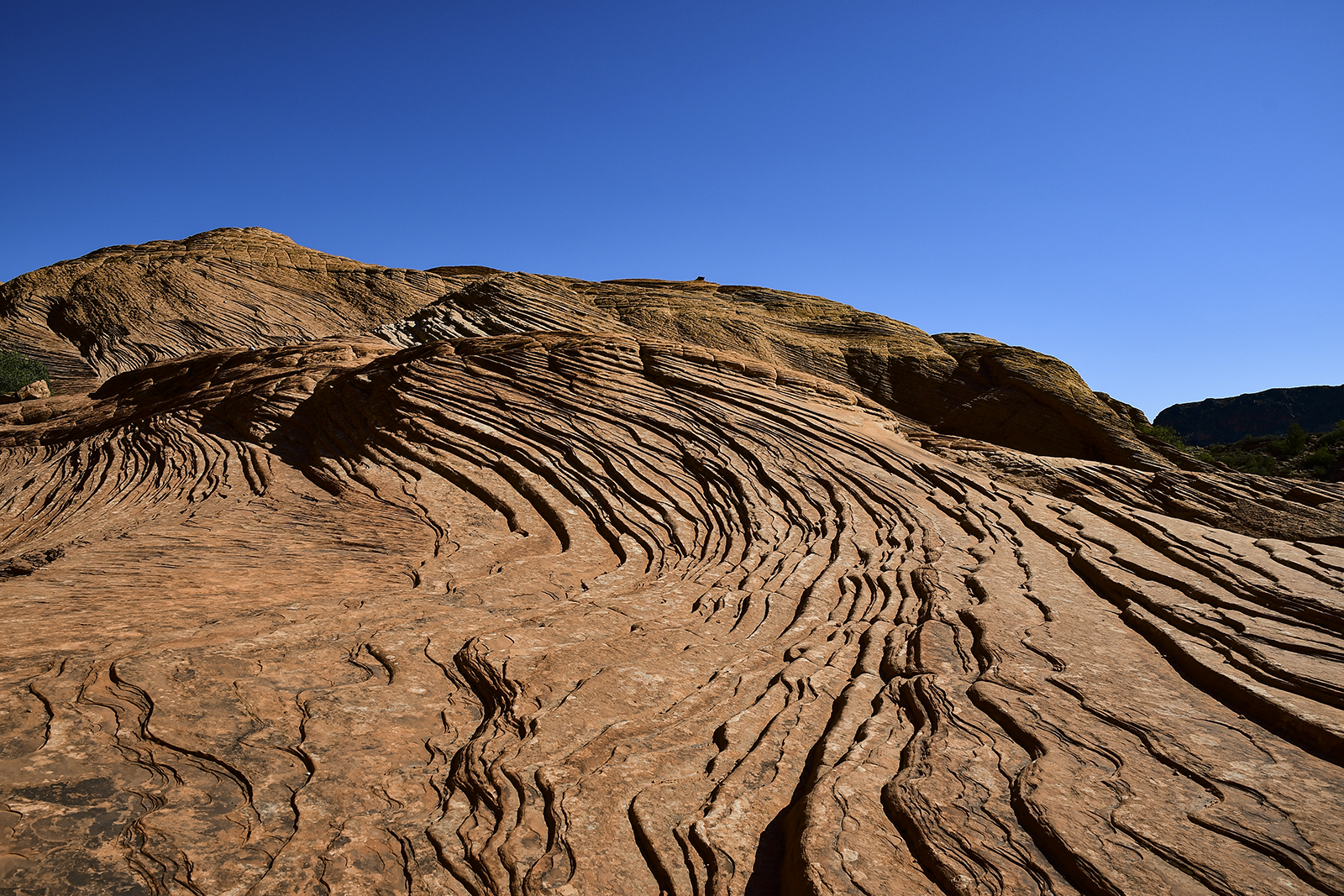 Auf der gegenüberliegenden Seite sehen wir in einiger Entfernung die versteinerten Sanddünen. Vor Jahrmillionen waren es ganz normale Sanddünen. Dieser Sand würde dann durch hohen Druck und viel Hitze zu Stein.