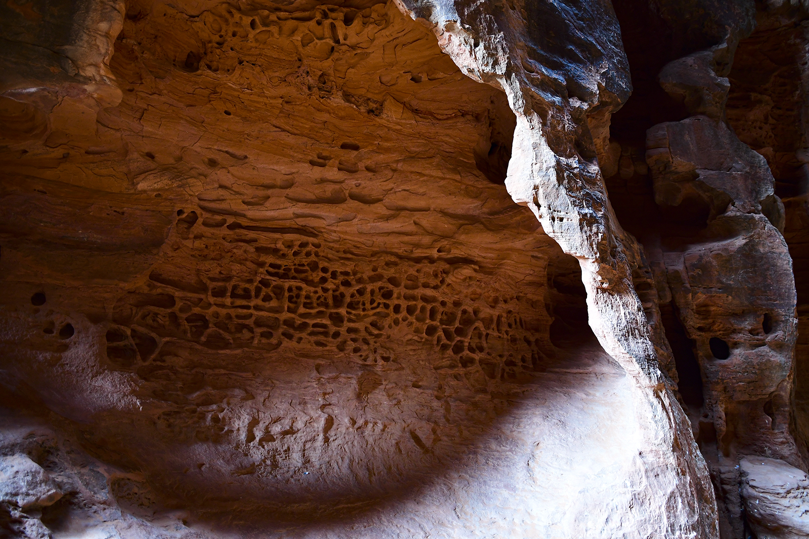 Der rote Fels ist komplett zerlöchert und erinnert an einen Schweizer Käse.