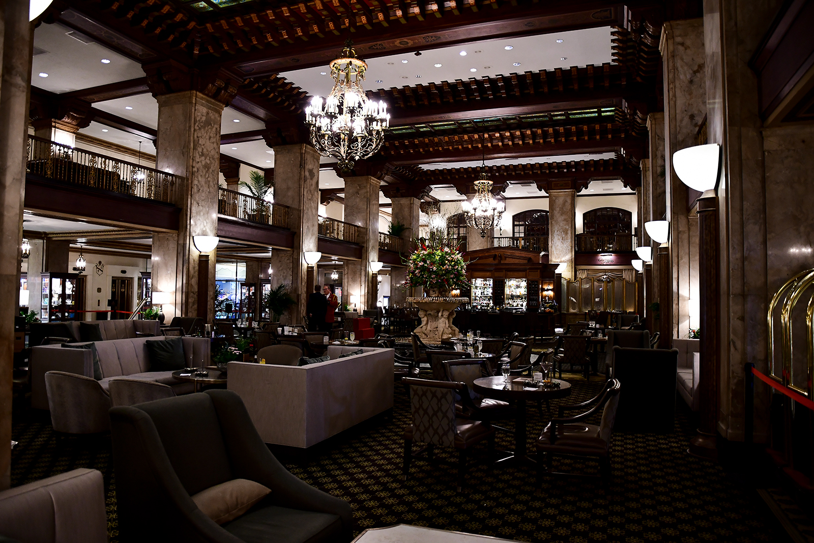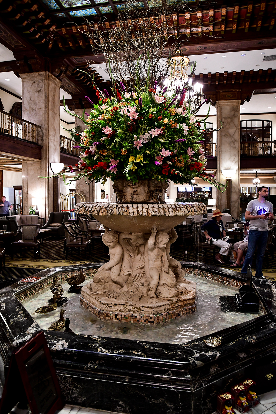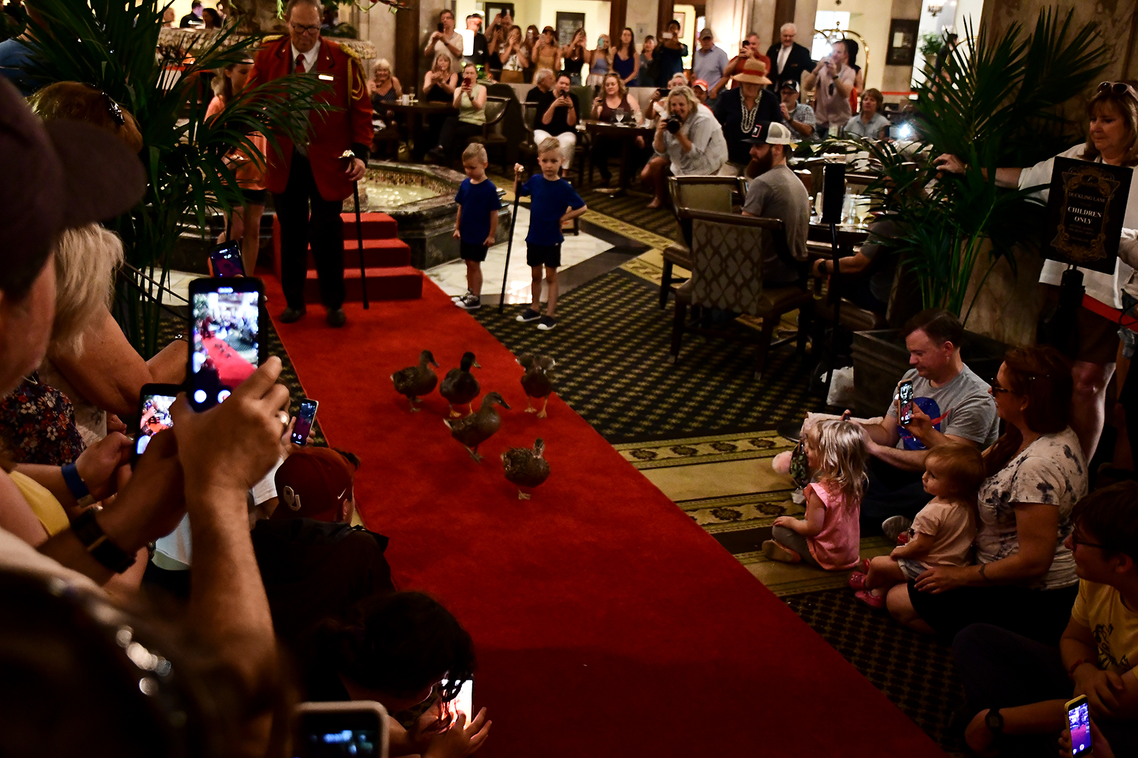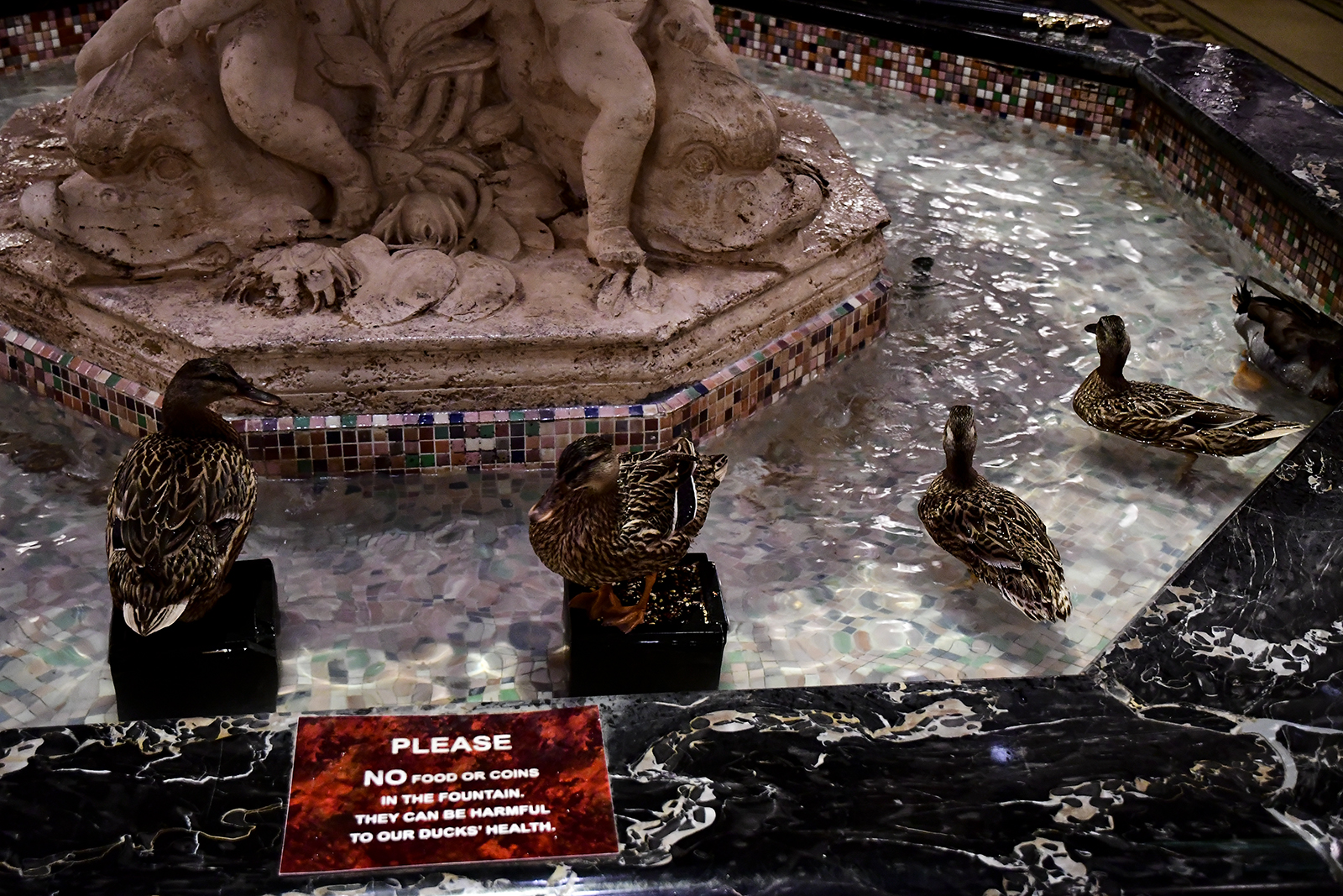 In diesem Hotel wohnen ein paar Enten auf dem Dach. Jeden morgen um 11:00 Uhr fahren die Enten selbständig nach unten in die Lobby um ein Bad im Springbrunnen zu nehmen. Um 17:00 Uhr fahren sie dann wieder im Aufzug selbständig nach oben zum Schlafen. Es ist halb 5 und wir wollen uns dieses Schauspiel nicht entgehen lassen.