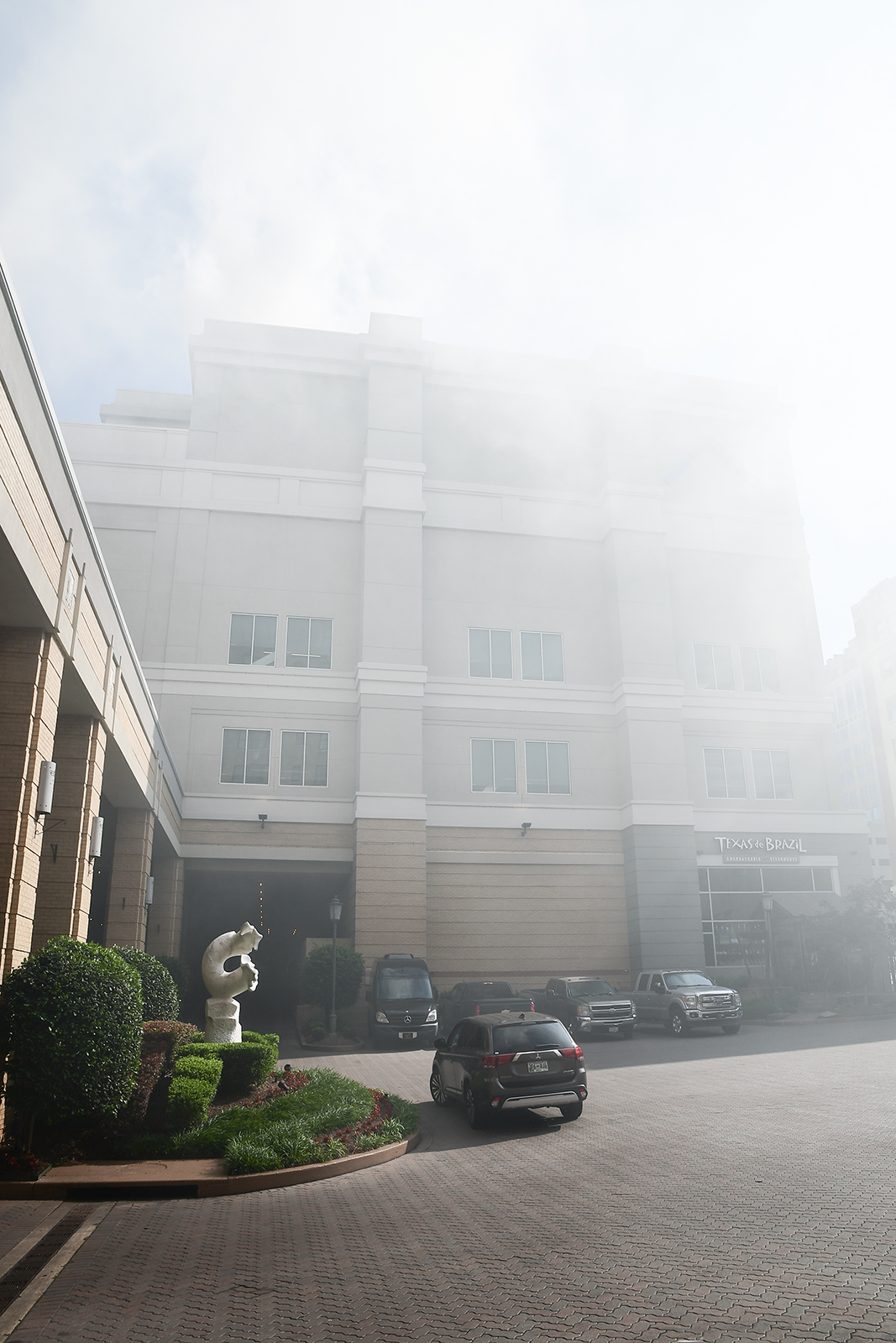 Wild fuchtelnd und hysterisch schreiend drückt uns die Angestellte nach draußen. Draußen angekommen beträgt die Sichtweite ca 20 Meter. Alles ist in weißgelbem Qualm verhüllt.