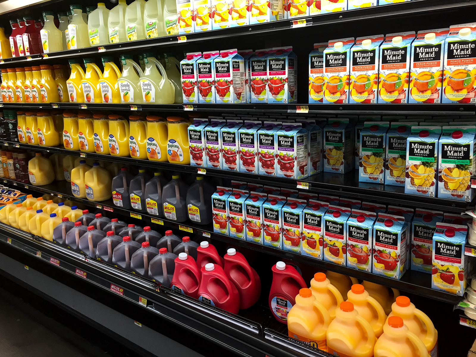 Getränke wie Orangensaft und Co gibt es hier auch – kleinste Verpackungsgröße sind 4,75 Liter.