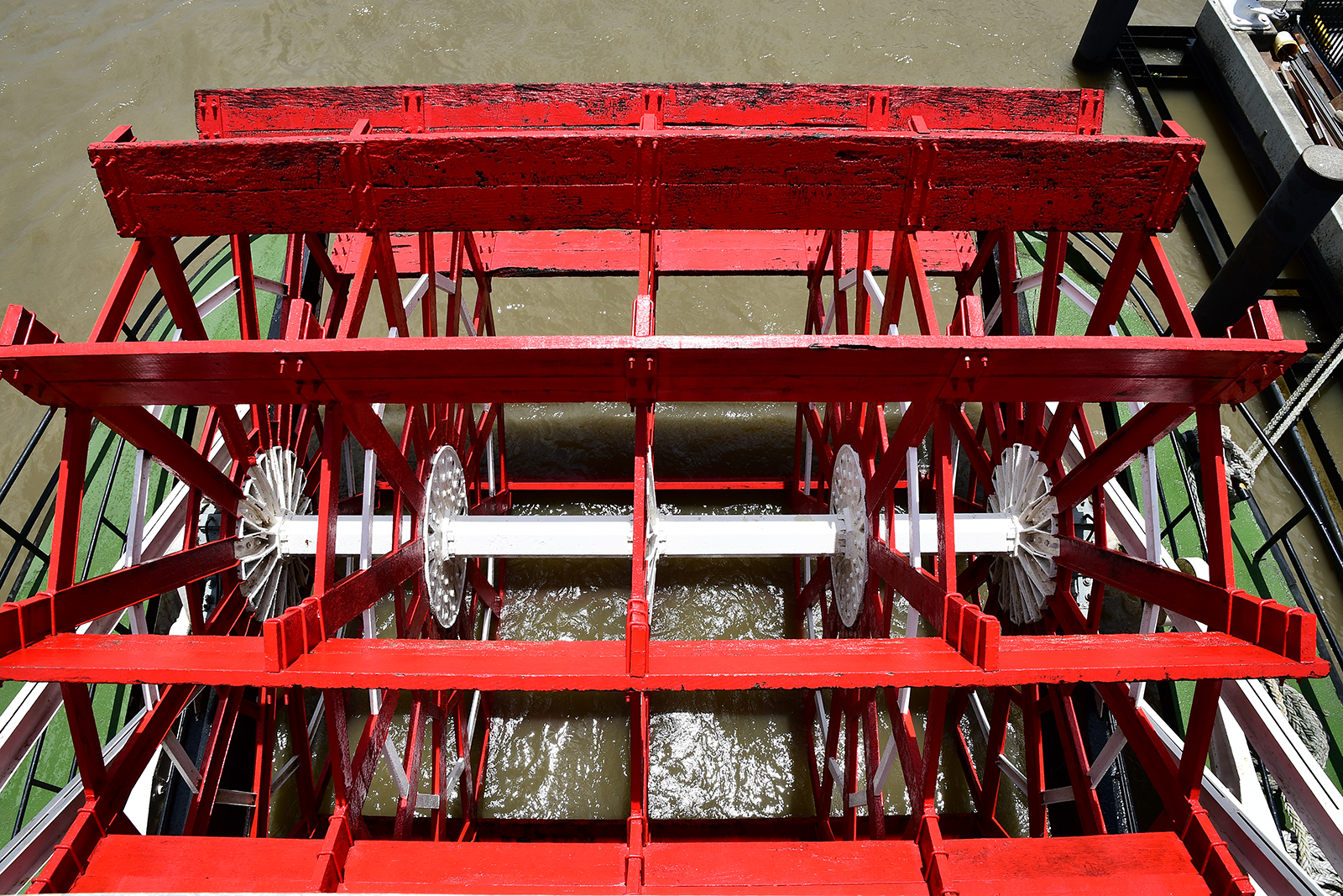 Zu meiner Verwunderung schaukelt das Schiff kaum. Der Druck in den großen Kesseln steht bereits zur Verfügung und bringt die riesigen Antriebskolben in Bewegung. Das große Schaufelrad am Heck treibt das Schiff langsam vorwärts. Hier oben auf dem Oberdeck bemerkt davon nichts. Ruhig und zügig gleitet der Dampfer durch den Mississippi.