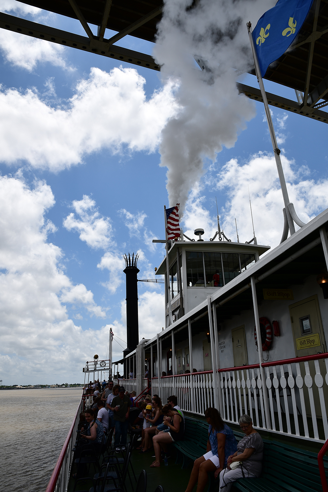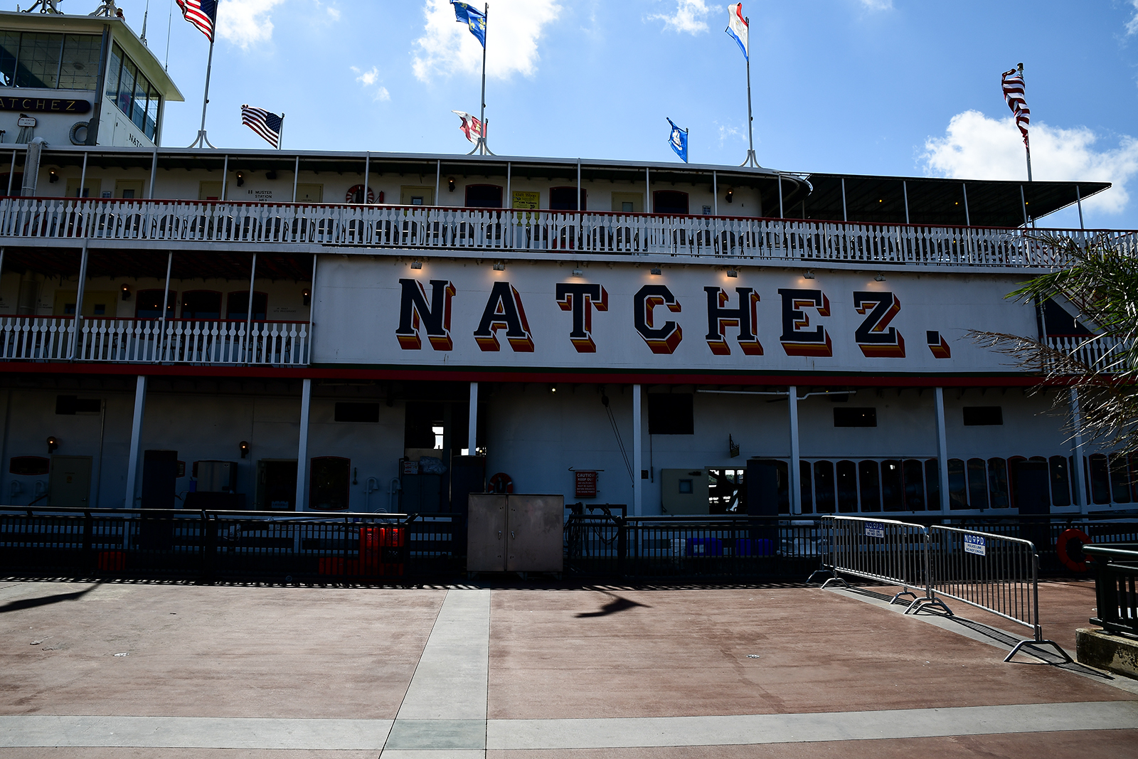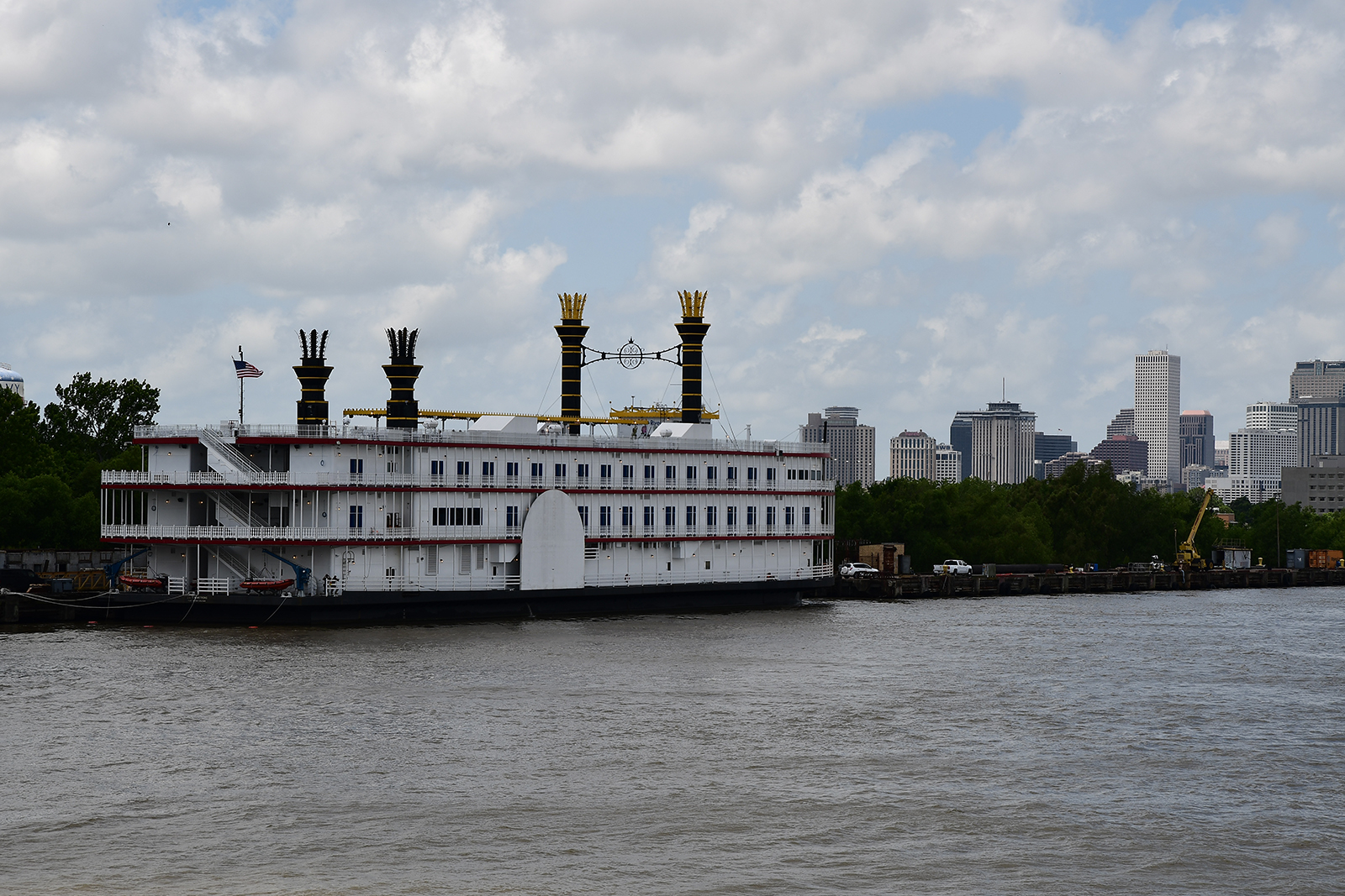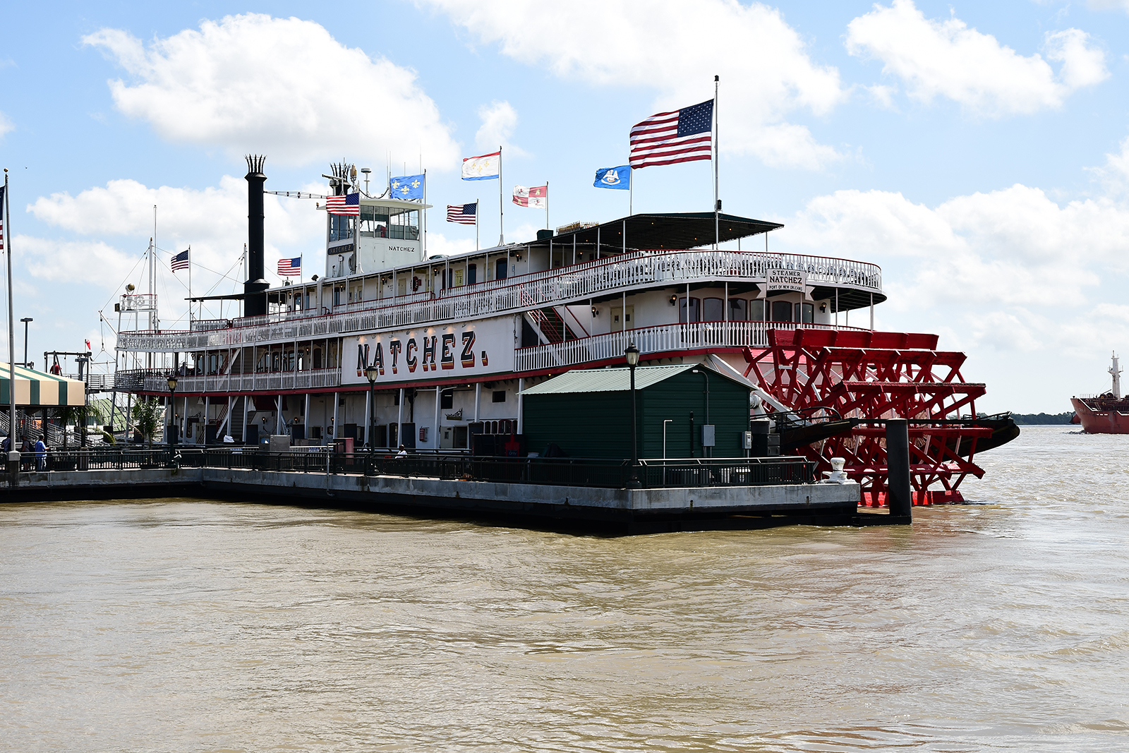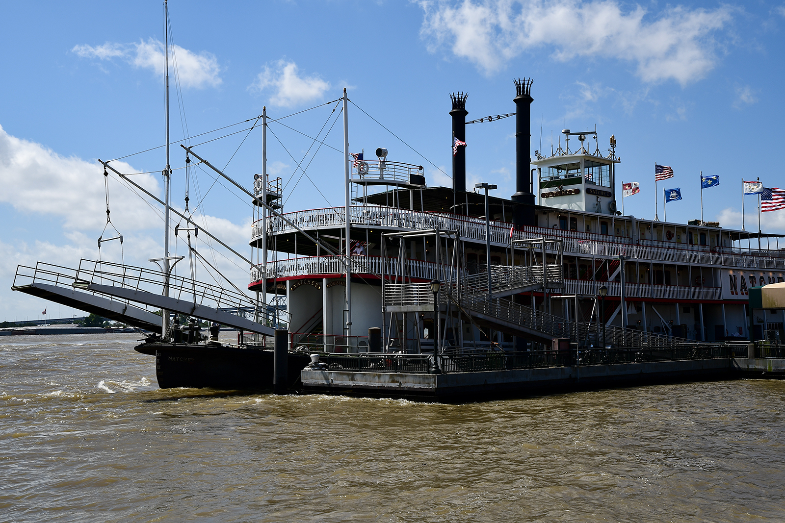 Hier liegt die Natchez – ein alter Mississippi Schaufelraddampfer aus dem letzten Jahrhundert. Es ist der einzig noch existierende Schaufelraddampfer der noch mit dem alten originalen