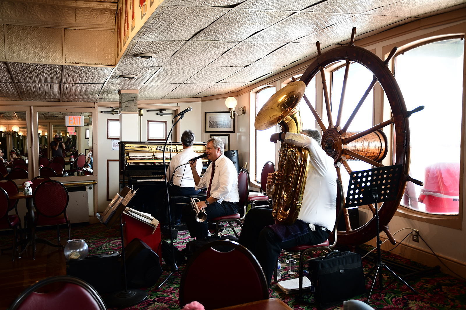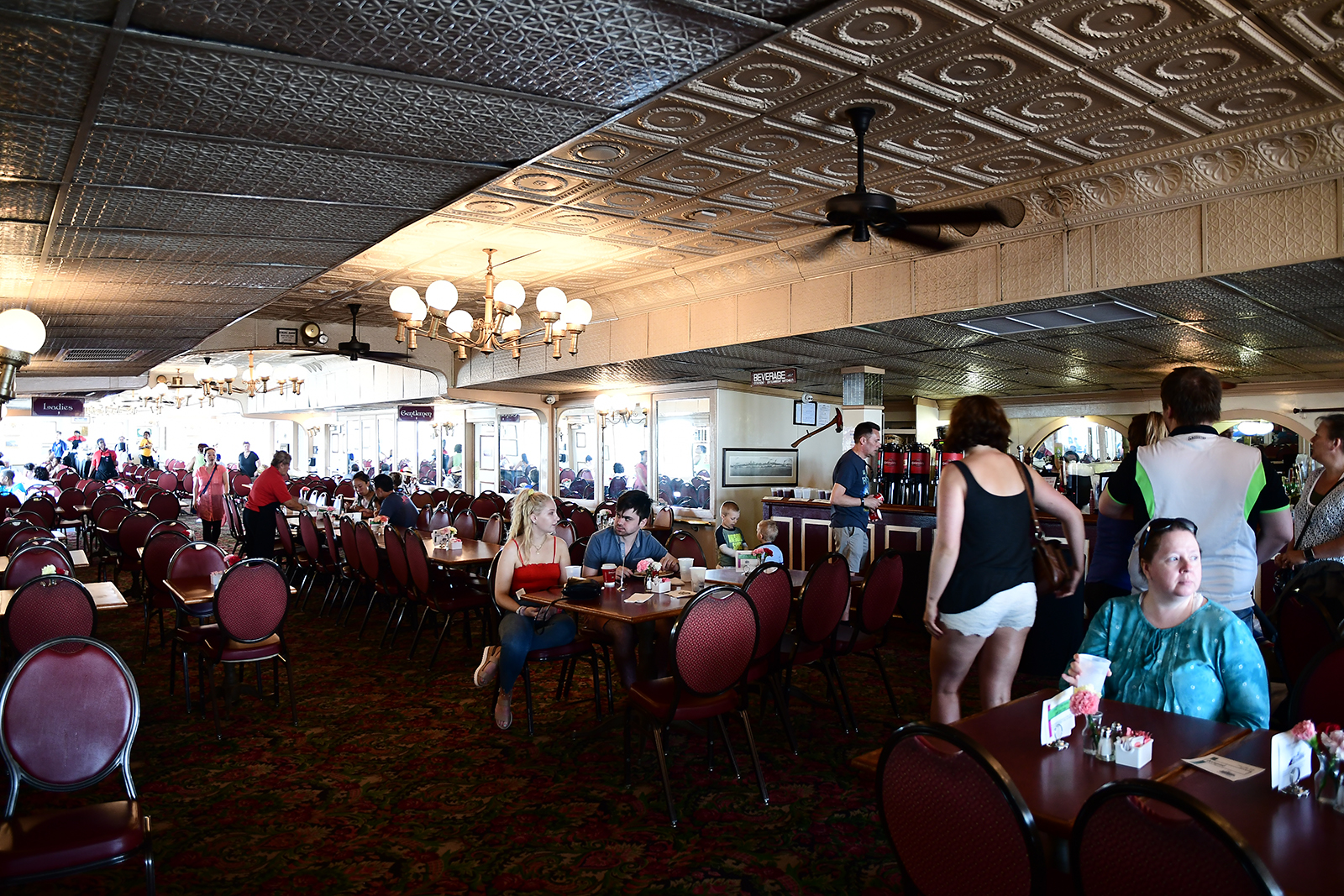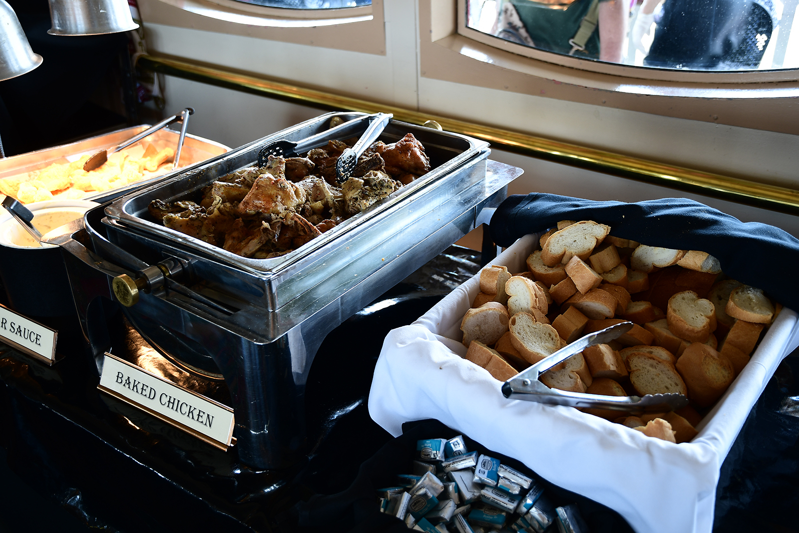 Unten im Schiff ist das Buffet im alten Ballsaal eröffnet. Es gibt typisches Essen aus New Orleans.