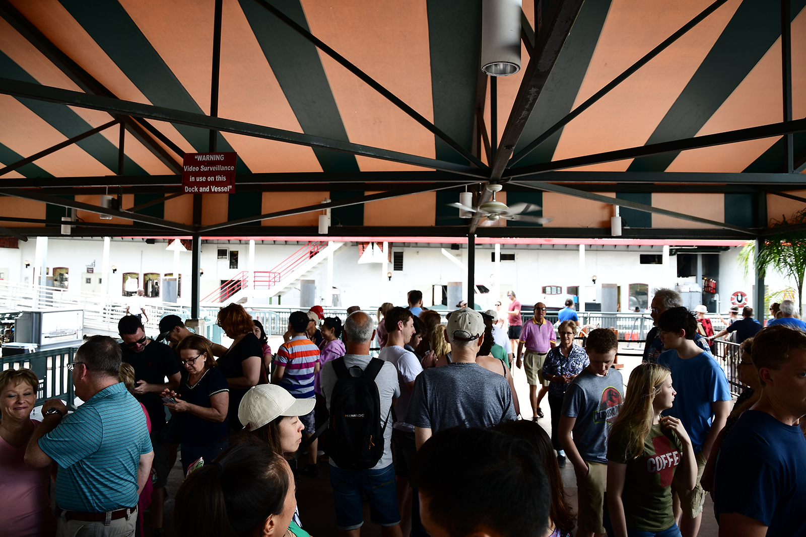 Nach einiger Wartezeit dürfen alle auf das Schiff. Wie immer hier in Amerika geht es sehr geordnet zu. Keiner drängelt. Jeder lässt dem Anderen den Vortritt. Wir suchen uns einen schattigen Platz hinten auf dem Oberdeck. Hier oben ist es dann sehr windig. Zum Glück ist es windig. Wir sind in den Südstaaten und wir haben fast Juni. Es ist heiß. Wir haben um die 35 Grad und einen fast wolkenlosen Himmel. Nach und nach gelangen die Passagiere auf das Schiff und suchen sich einen Platz. Plätze gibt es hier genug. Kein Gedränge, kein Gerangel. Dann werden die Leinen gelöst und wir driften langsam in Richtung Flussmitte.