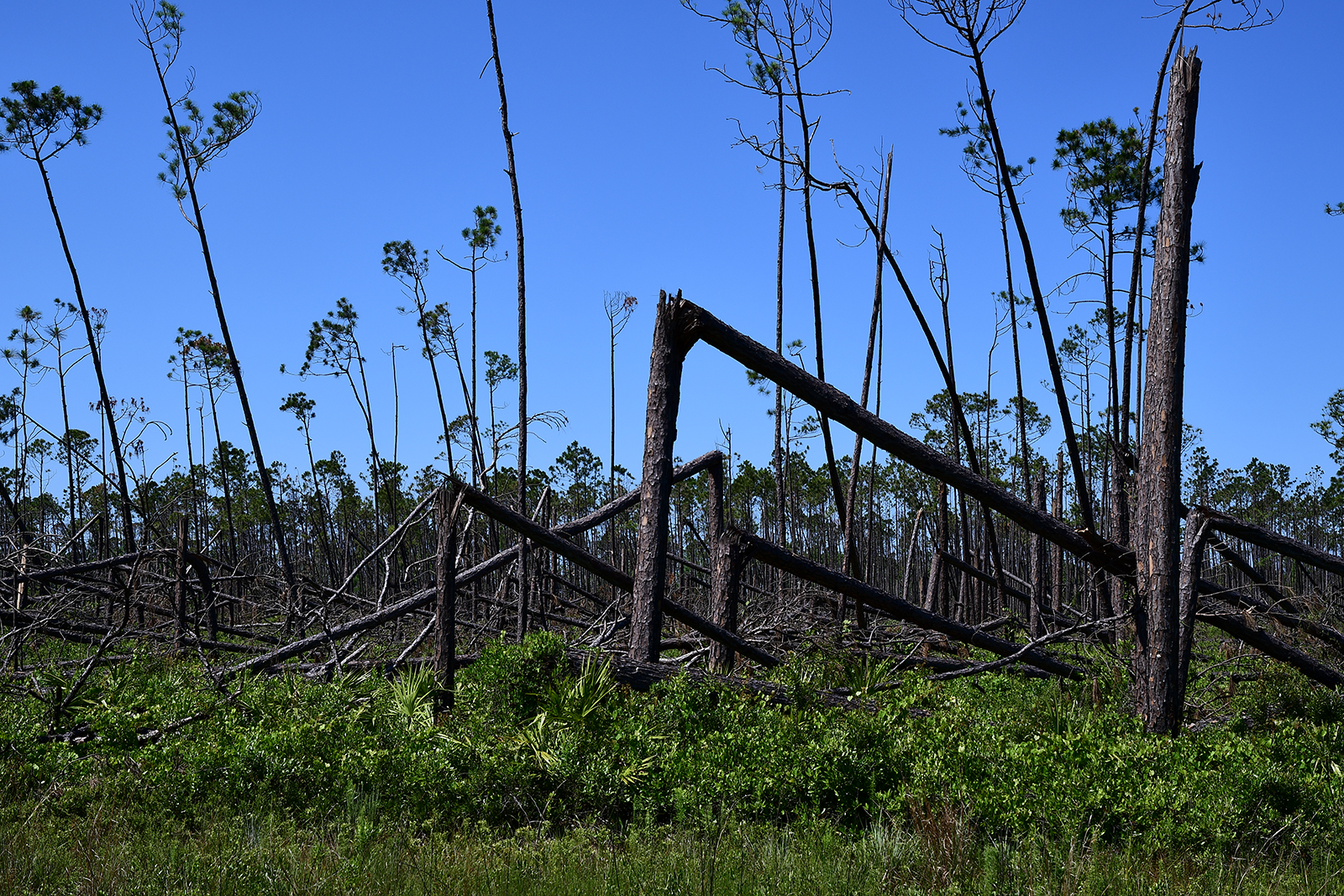 In wenigen Minuten wurde eine Fläche fast so groß wie Bayern fast völlig ausradiert. Wir fahren an völlig zerstörten Supermärkten und Häusern vorbei. In riesigen Waldstücken liegen alle Bäume entwurzelt noch völlig durcheinander. In anderen Waldstücken hat der Sturm die großen Bäume einfach wie Streichhölzer in der Mitte abgeknickt.