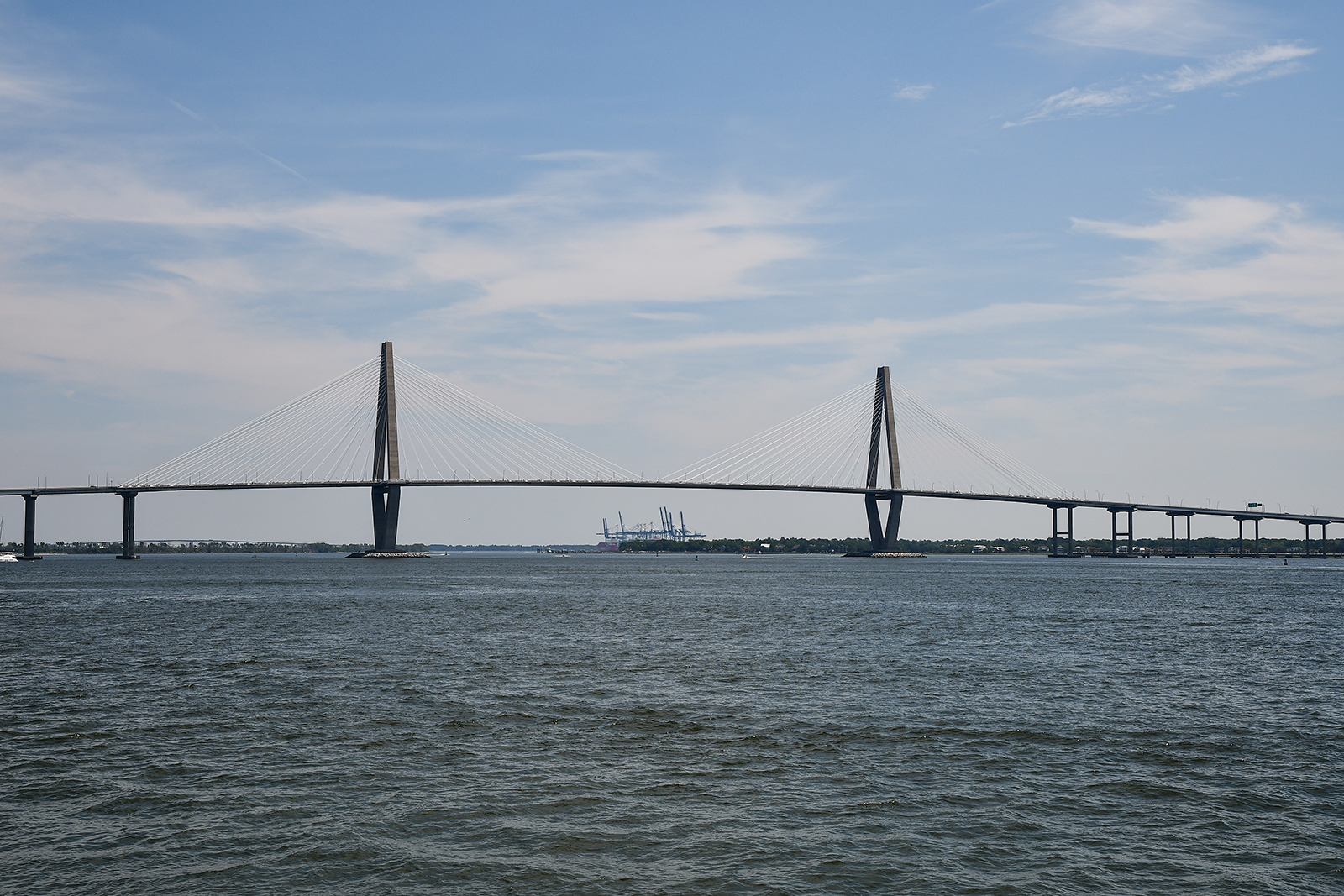 Nach etwas warten dürfen wir auf unser Boot um auf die Insel zu kommen und fahren von der Anlegestelle an der großen Brücke von Charleston vorbei.