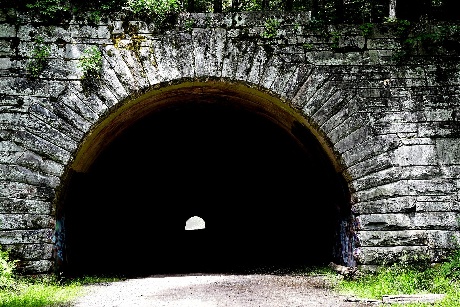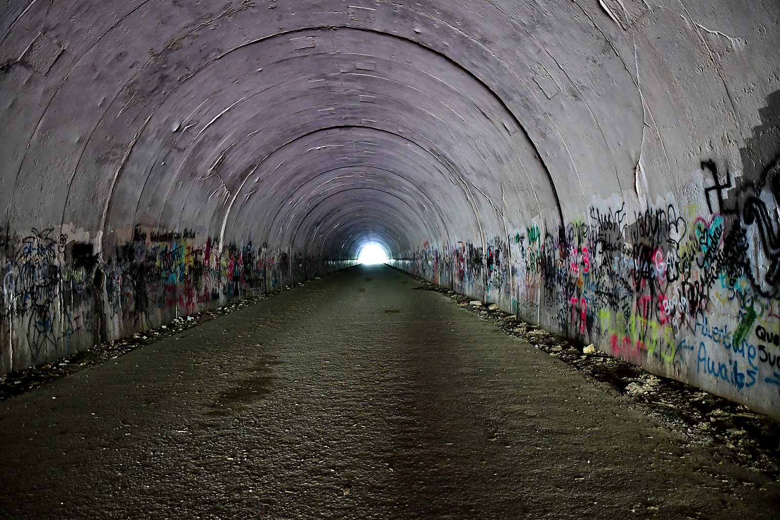 Nach kurzer Zeit stehen wir tatsächlich vor einem recht neuen langen Tunnel. Wir stehen vor einem großen schwarzen Loch. In der Mitte des Tunnels ist ein gleißendes Licht zu sehen. Ich kann nicht sagen ob es die Mitte oder das andere Ende des Tunnels ist. Irgendwie unheimlich ist das jetzt schon. Mann kann auch nicht wirklich abschätzen wie lange dieser Tunnel ins nirgendwo wirklich ist.