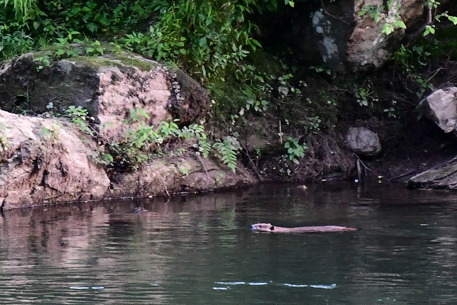 Unten angekommen sehen wir plötzlich einen Biber im Wasser der einsam seine Bahnen im glasklaren Wasser zieht.