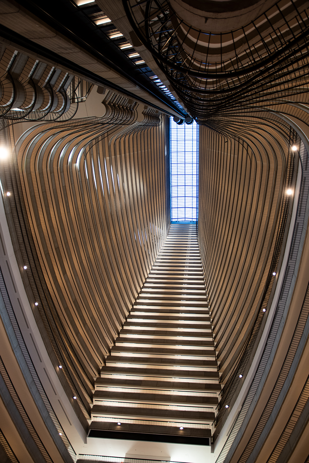 Plötzlich stehen wir vor dem Luxushotel Marriott. Marriott – hier in der futuristischen Innenarchitektur wurden einige Szenen von „Tribute von Panem“ gedreht. In den Aufzügen die an Star Wars erinnern wurde Katniss Everdeen (Jennifer Lawrence)ins Kapitol gebracht. Hier müssen wir rein. Doch wie kommt man in ein super Luxushotel ohne Gast zu sein. Ganz einfach. Wir haben uns einfach als Touristen verkleidet und schleichen uns an den Pförtnern vorbei in die Empfangshalle. Dann stehen wir im Kapitol von Panem. Der Anblick des Gebäudes ist sehr beeindruckend. Man hat den Eindruck dass man sich bereits in der Zukunft befindet.