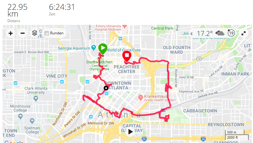 Nach der Getränkebestellung gibt es auch schon die Speisekarte und wir werden beraten was wir nehmen könnten. Nach der Bestellung kommt dann ein „OK vielen Dank – ich bin gleich wieder zurück“ Kurze Zeit später steht das Essen auf dem Tisch. Alles ist handgemacht und frisch zubereitet – was man bei einem Blick in die Küche durch die Glasscheibe erkennen kann. Nach wenigen Minuten ist die Kellnerin zurück. „Alles klar bei Euch? Braucht ihr noch was?“ 5 Minuten später kommt die Chefin vorbei. „Hallo Leute schön dass ihr den Weg zu uns gefunden habt! Ist alles OK? Braucht ihr noch was? „Nein alles super Danke“. Kurz bevor der Teller leer ist geht die Küchentür auf und der Koch kommt an unseren Tisch.“Hey Leute, danke das ihr uns besucht. War alles OK? Hat das Essen das ich Euch gemacht habe geschmeckt?“ „Braucht ihr noch was „Nein vielen Dank – alles war super lecker.“ Vielen Dank – denn wünsche ich Euch noch einen super schönen Aufenthalt bei uns und einen schönen Tag „So ist das hier immer in Amerika – bei uns undenkbar. Am späten Nachmittag geht es nach Atlanta Downtown zurück. Als wir in Atlanta ankommen geht die Sonne bereits unter. Wir beschließen noch ein paar Runden um die Blocks zu laufen – in einer der gefährlichsten Städte der USA – sagt man.