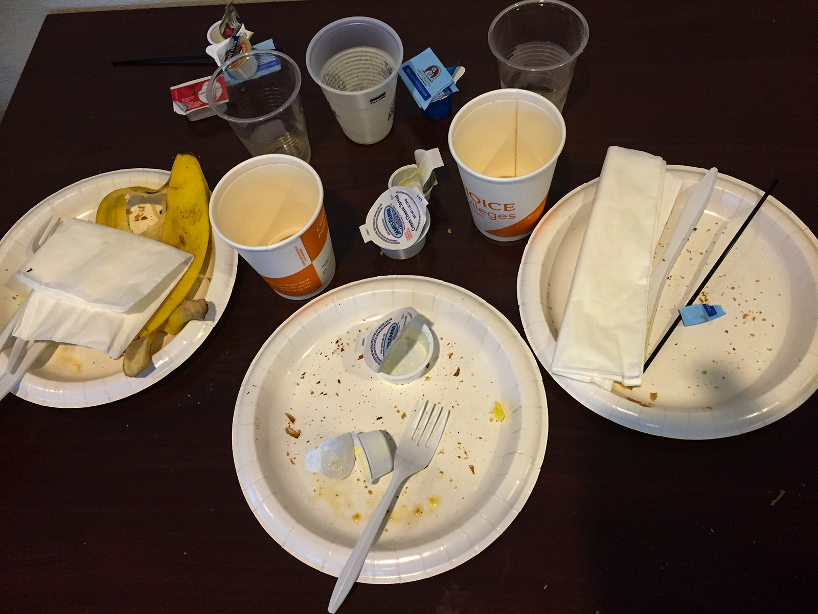 Nach dem Frühstücken werde ich nachdenklich über den Müll den alle hier schon alleine beim Frühstück produzieren.