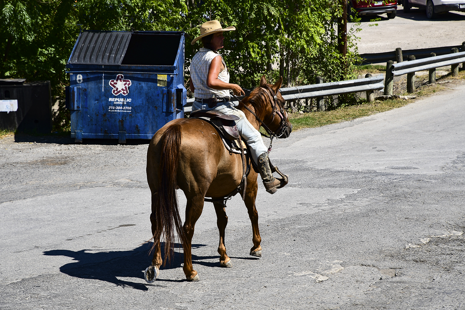 Plötzlich aber nicht ganz unerwartet kommt einer der Cowboy*innen* (ha endlisch mal gedschendert) mit ihrem Pferd um die Ecke und begrüßt uns. Howdy.