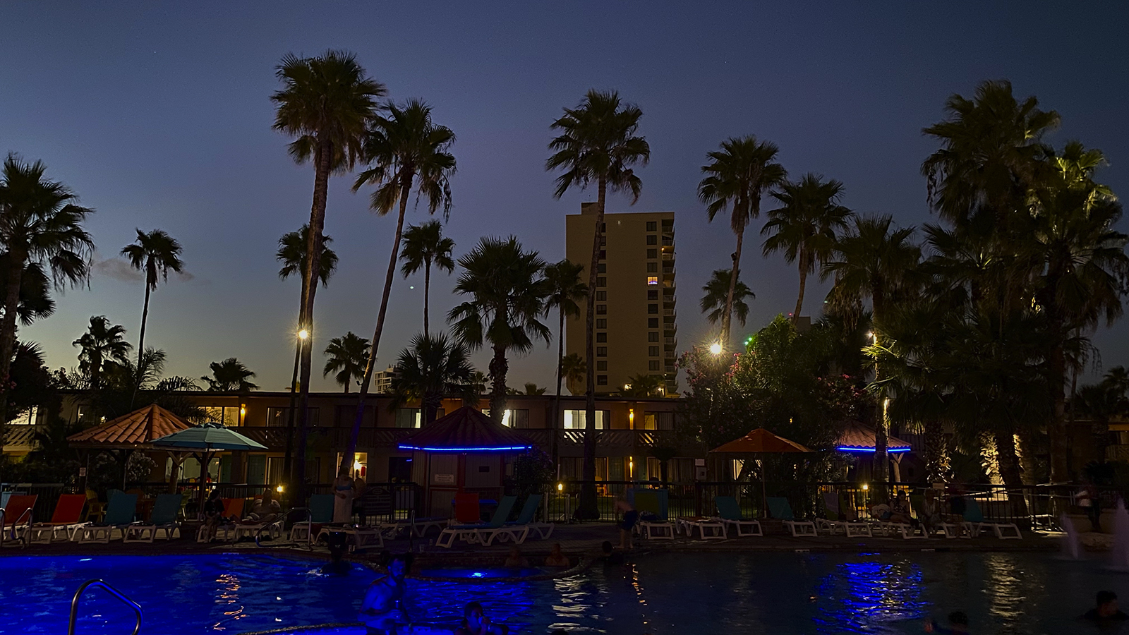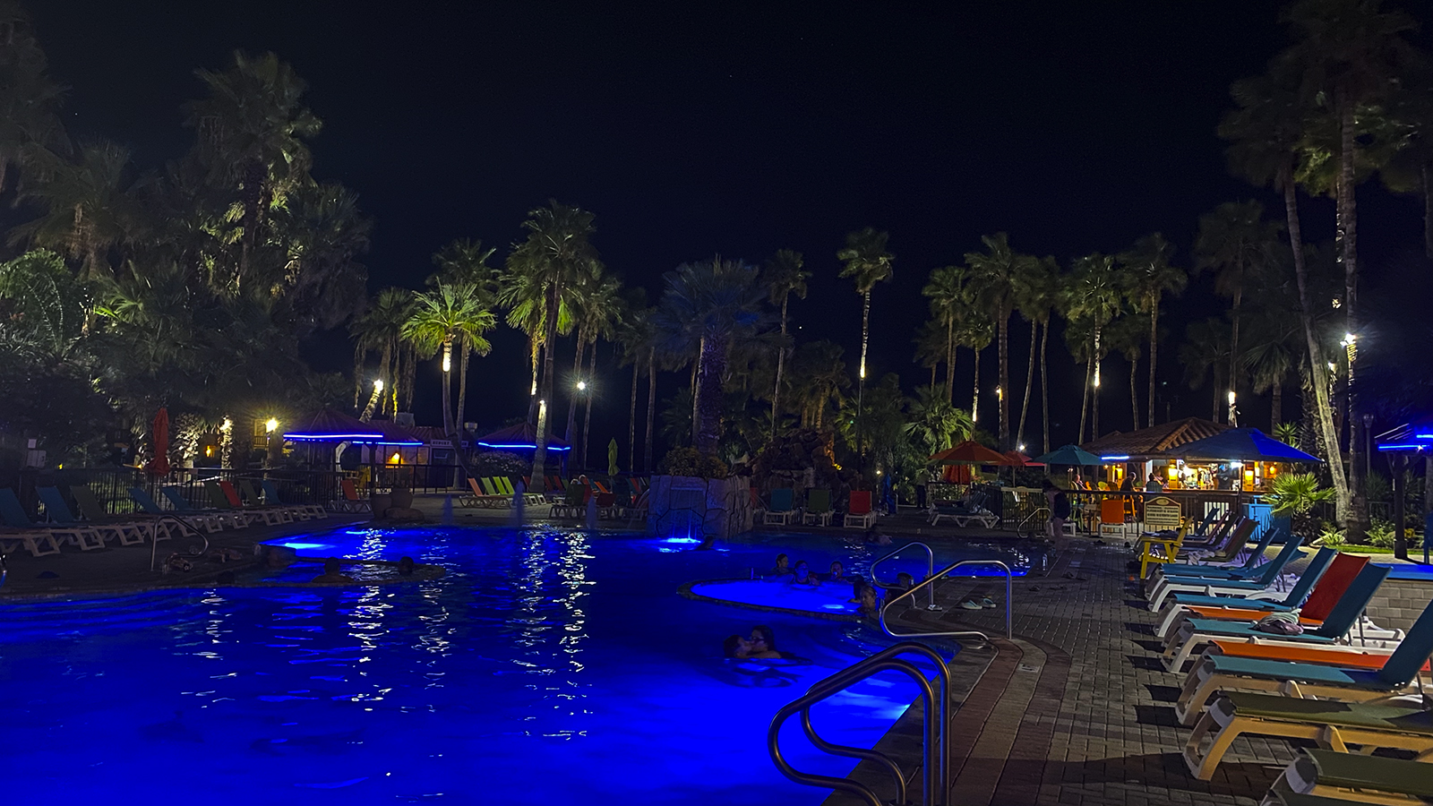 Nach dem Essen schlendern wir noch einmal bei über 30 Grad und sternenklarem Himmel über den Strand und am Pool vorbei in unser Zimmer.