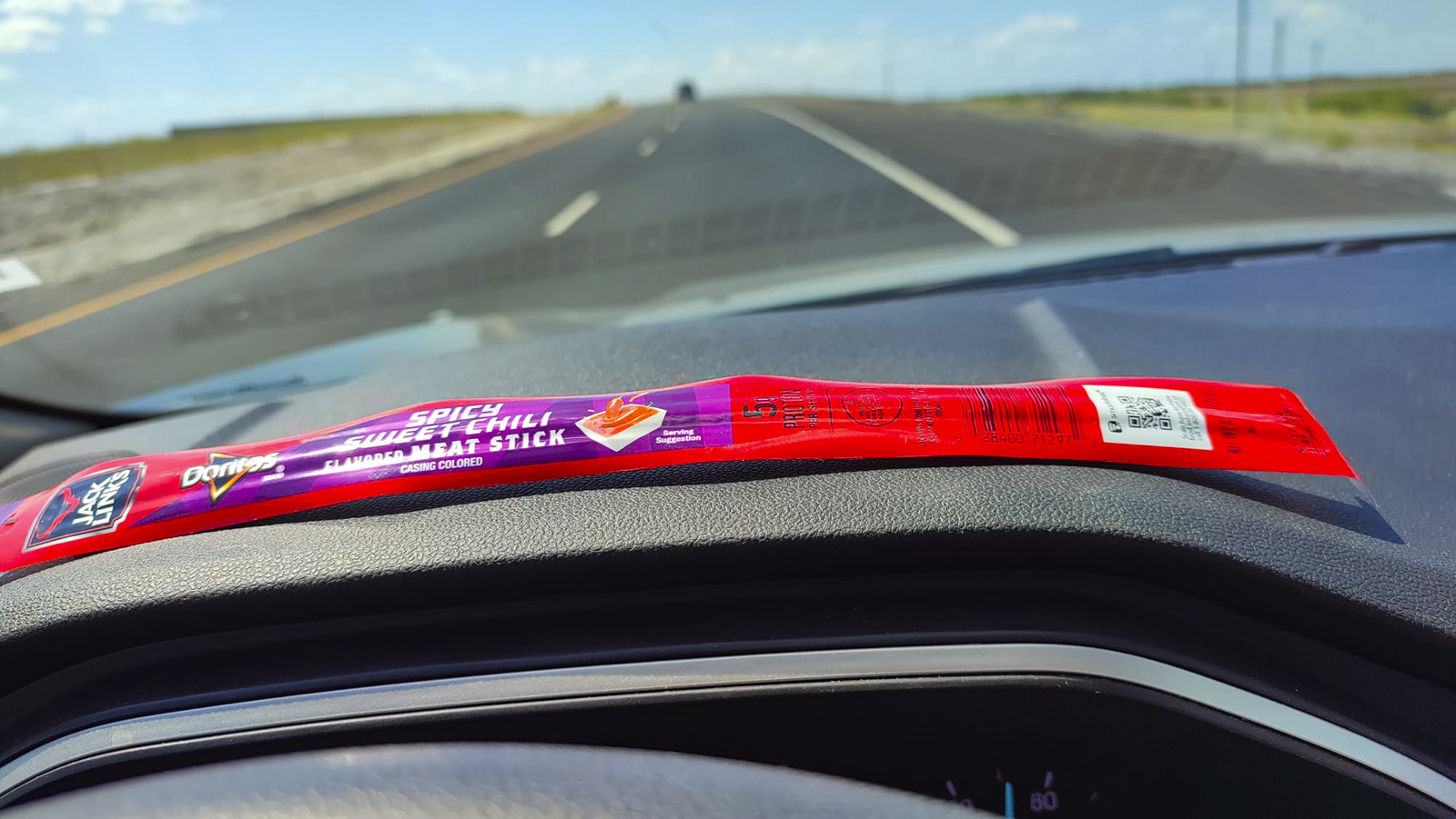 Wie immer bei einer langen Fahrt in den USA habe ich natürlich etwas zu knabbern dabei. Und wie immer ist es natürlich das hier so beliebte Trockenfleisch – heute mal in einer riesigen BIFI Form.