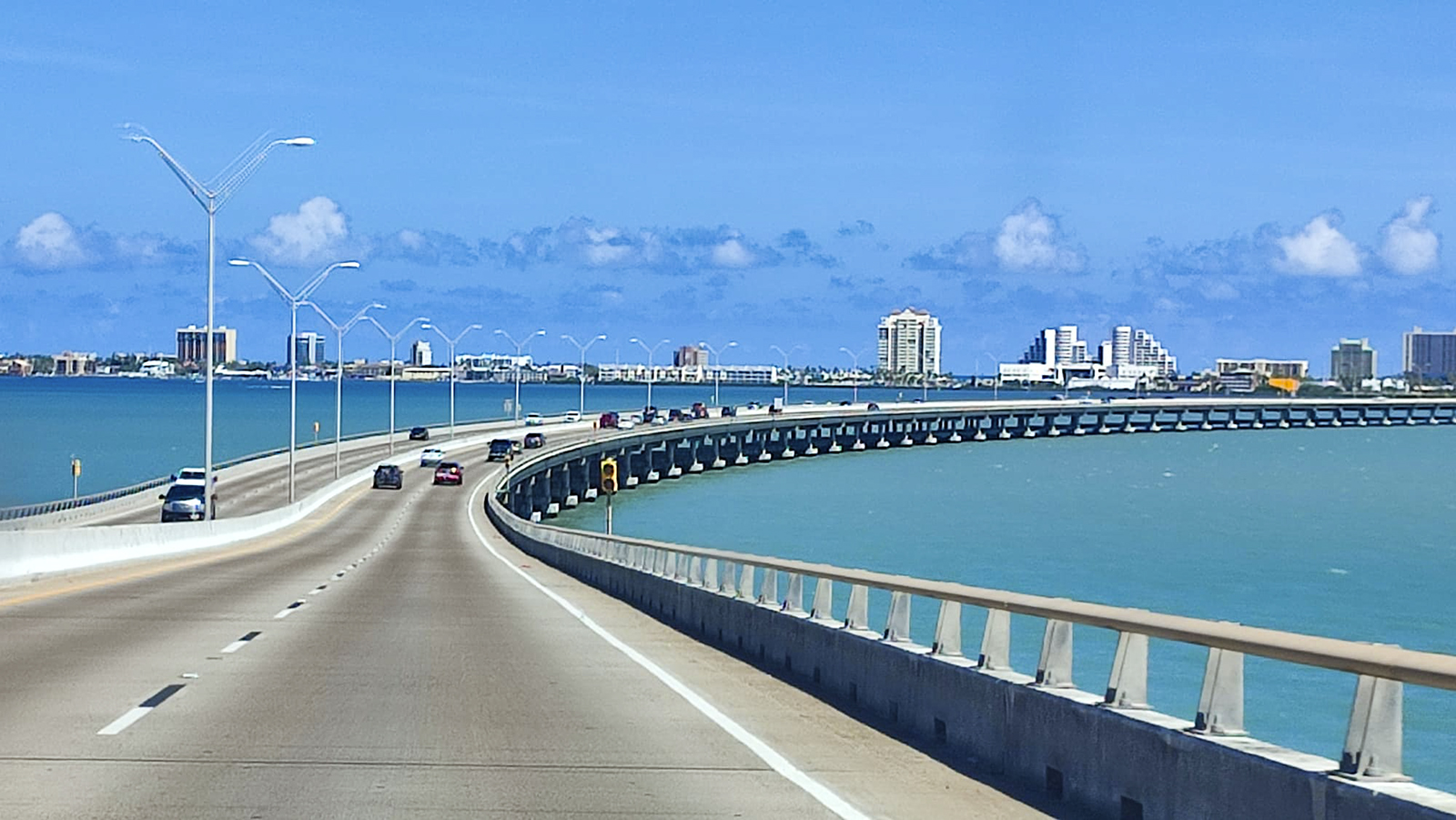 Über eine riesige Brück gelangen wir vom Festland auf die vorgelagerte Außeninsel im Golf von Mexico.