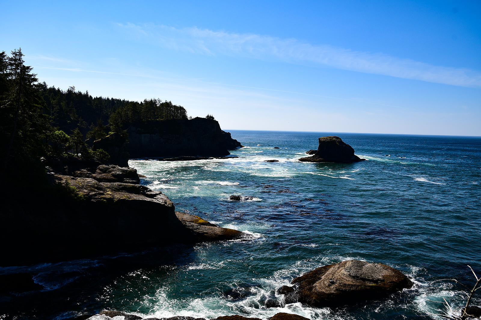 Nach einiger Zeit erreichen wir das Kap. Der Weg und die 20$ sind es wert hierher zu kommen. Ein atemberaubender unglaublicher Anblick. Riesige Wellen krachen mit lautem Donner gegen die hohen Felswände. Auf der einen Seite mündet die Juan-de-Fuca Straße in den Pazifischen Ozean und auf der anderen Seite schaut man in die Unendlichkeit des Pazifiks. Durch die hohen Wellen scheint sich der Anblick immer wieder zu verändern. Schwärme von Seemöwen ziehen kreischend über unsere Köpfe hinweg. Wieder ein einmaliges Schauspiel auf diesem Kontinent.