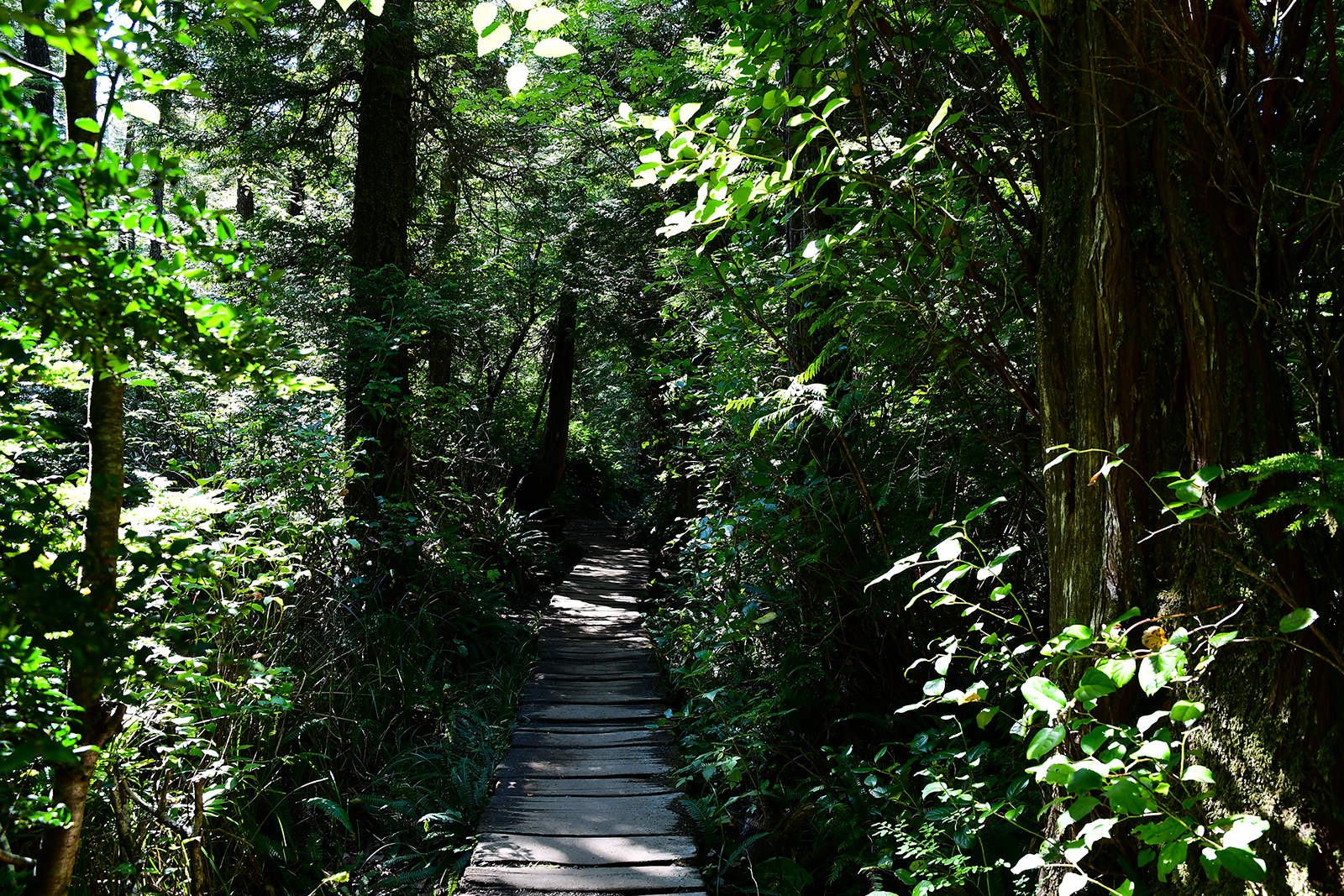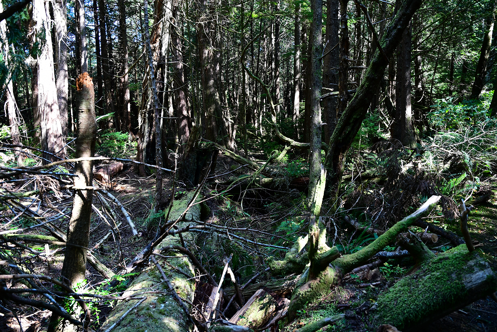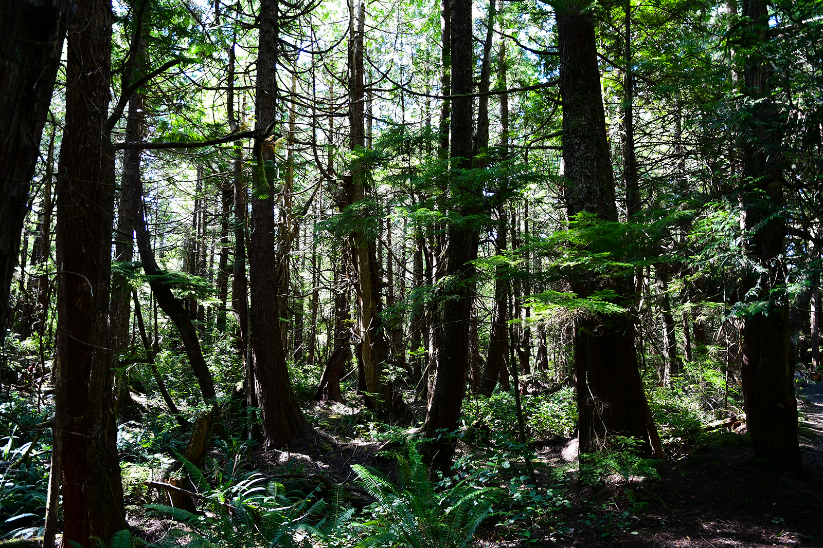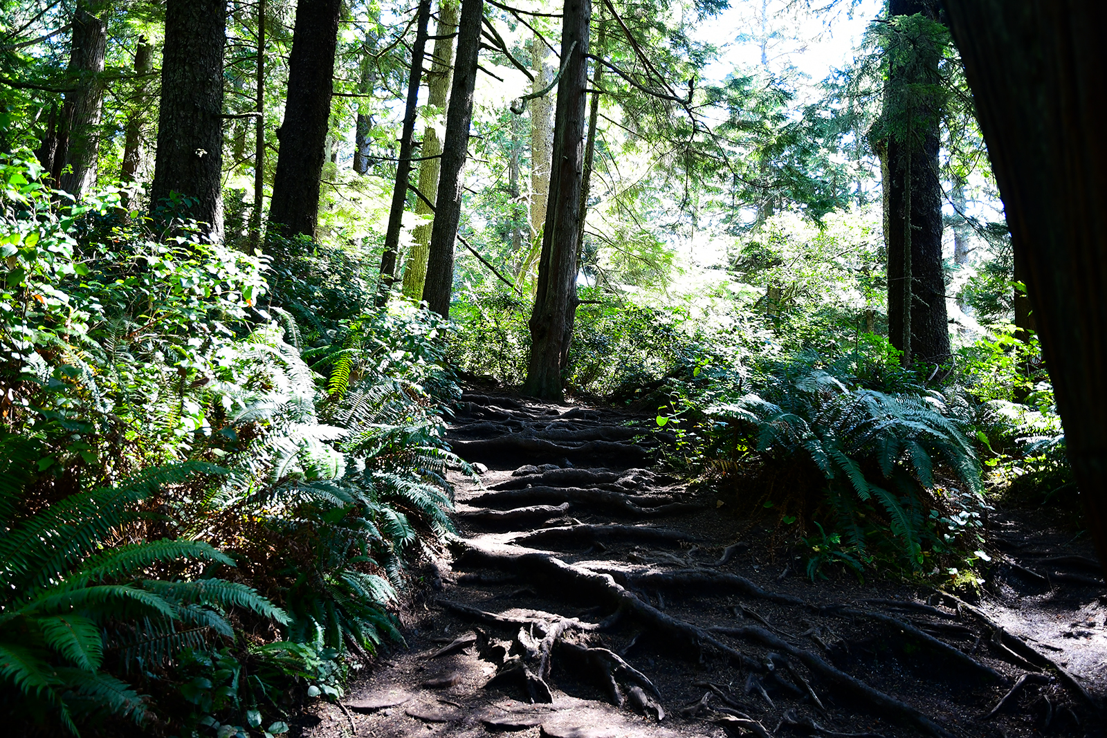Die letzten Meilen bis an diese Spitze müssen wir jedoch „erwandern“ – hier gibt es keine Straßen durch diese Wildnis. Wir wandern durch eine unglaubliche Wildnis. Über einen kleinen Pfad wandern wir durch einen uralten Wald mit großen Farnen und uralten moosbewachsenen Bäumen.