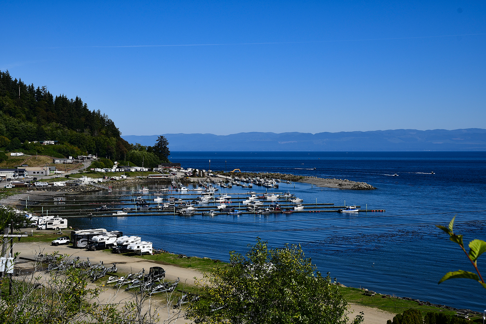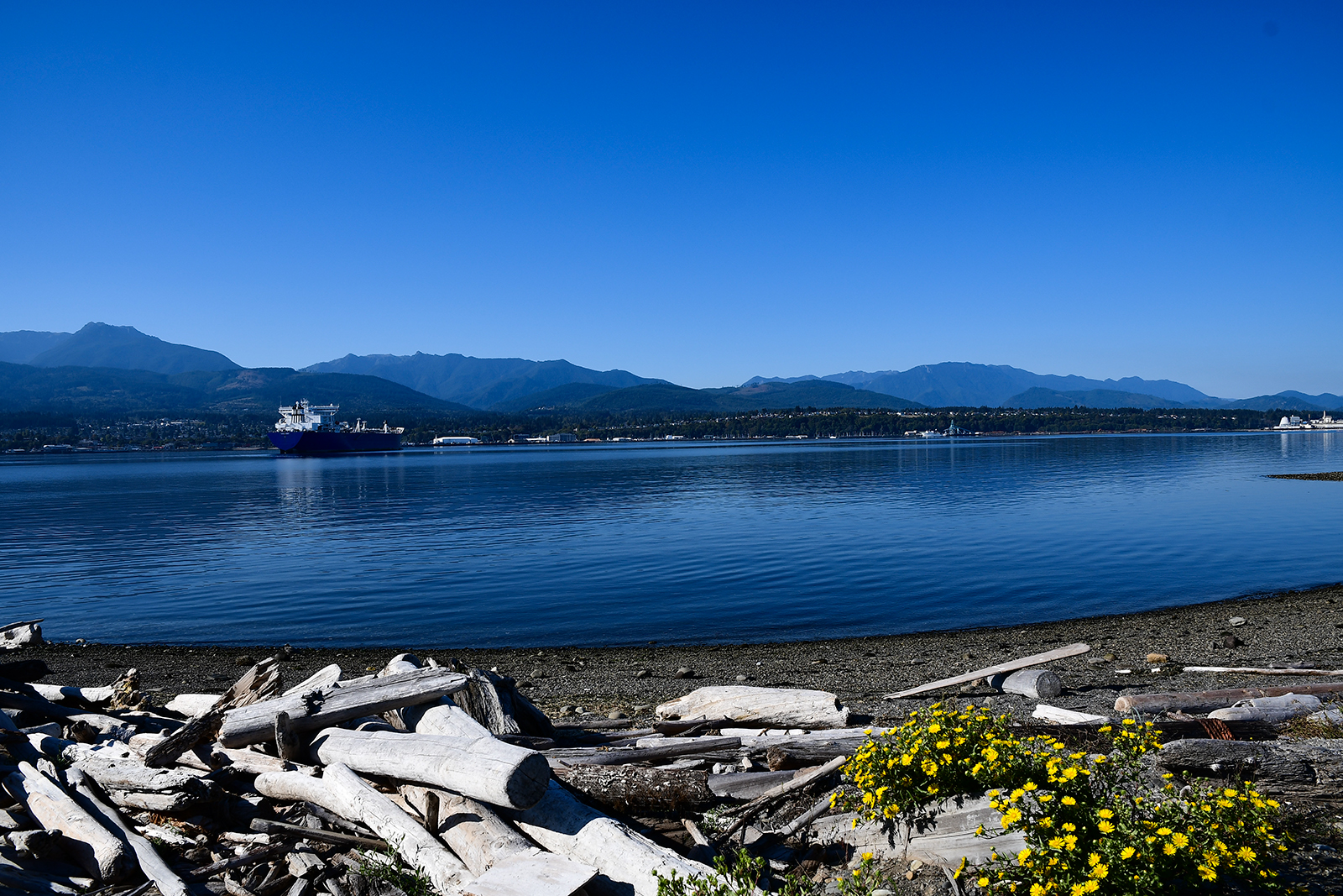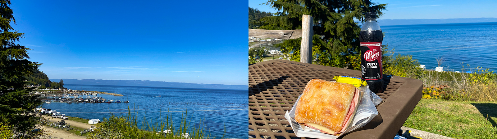 Wir fahren an der Salischen See entlang. Hierbei handelt sich es um einen Fjord bzw. um die Juan-de-Fuca Straße. Der Fjord und seine Umgebung bietet einen Lebensraum in dem sich Schwertwale, Seelöwen, Schwarzbären, Grizzly-Bären, Kolibris und pazifische Riesenkraken tummeln. Wir sind gespannt, ob wir irgendetwas davon sehen werden.
