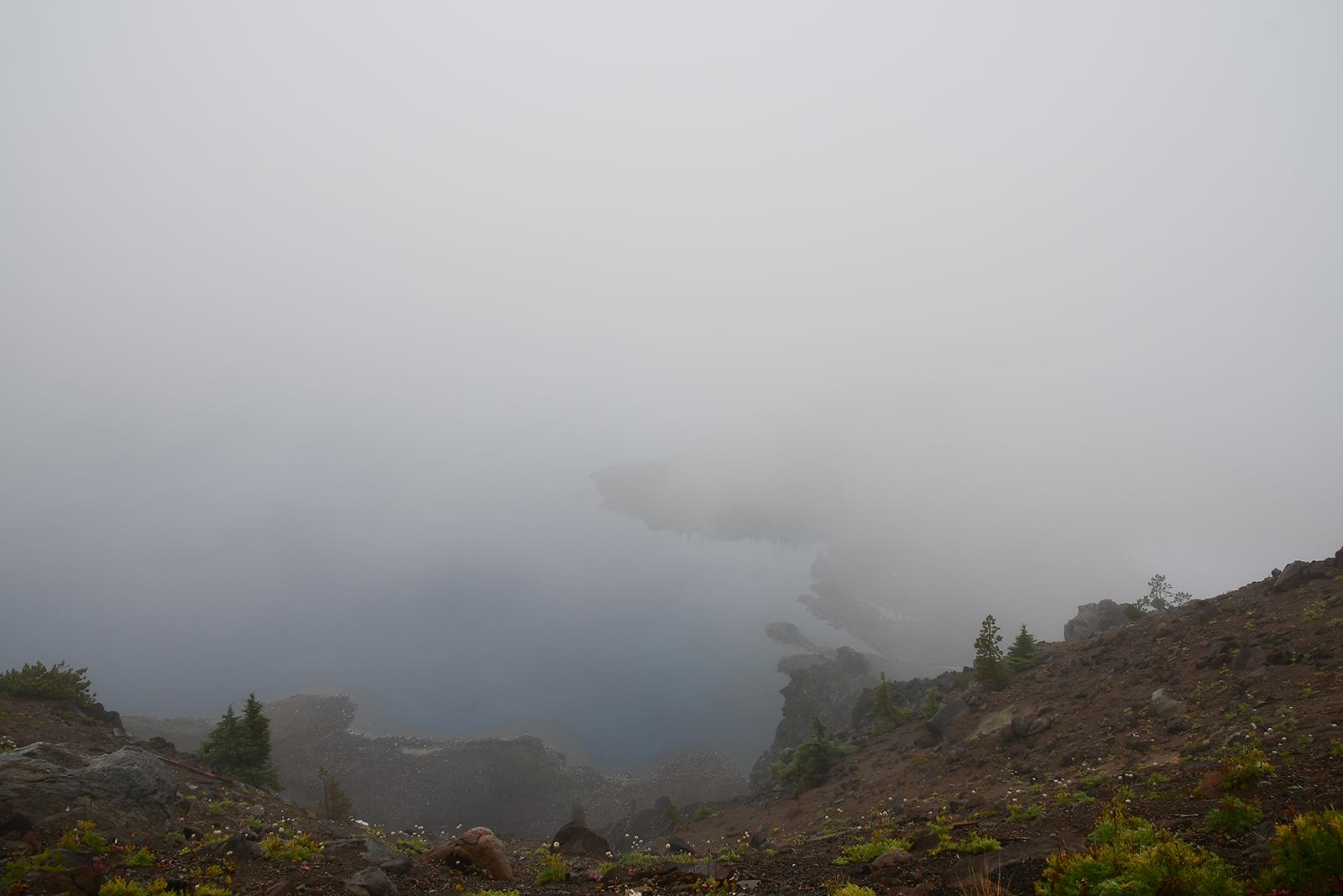 Dann endlich sind wir da. Wir erreichen den blausten See unseres Planeten. Er liegt direkt vor uns – also unter uns – also sollte er zumindest – irgendwo. Bei dem Anblick des Sees will bei mir keine wirkliche La Ola Welle entstehen. Ohne Zweifel ist er da – irgendwie. Das Blaueste aller Blaus lässt noch etwas zu wünschen übrig aber die Hoffnung stirbt zuletzt und am Himmel hellt es sich zunehmend auf. Etwas neues habe ich jedoch jetzt schon wieder über Amerikaner gelernt. Wenn sie das Haus verlassen und sich den Autoschlüssel vom Haken nehmen geben sie hier ihr Gehirn ab. Die Temperatur ist bei 2 Grad – Bodenfrost. Sichtweite direkt in den Wolken ca. 10-15 Meter. Rechts geht es hunderte Meter steil nach oben und links 1000 Meter steil nach unten. Die Serpentinen winden sich am Berg gepresst nach oben. Geschwindigkeitsbegrenzung ist bei 35 Meilen. Fährt man hier 35 wird man vom nächsten Truck über die Klippen geschupst.