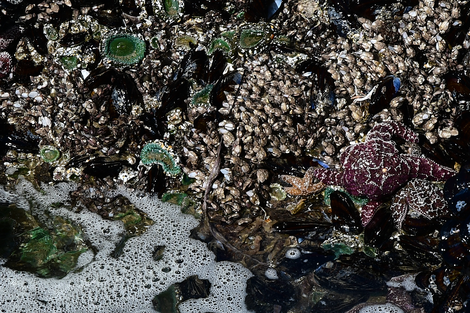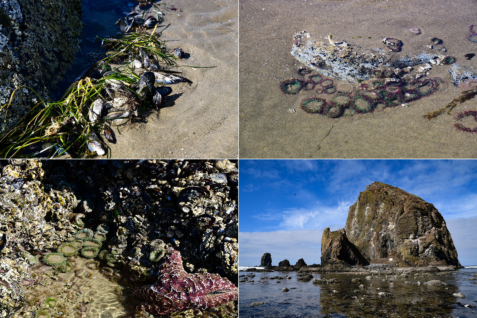 Wir wandern am Strand entlang. Zur Zeit haben wir hier Low Tide. Das bedeutet wir haben den niedrigsten Ebbestand für heute. Der pazifische Ozean gibt Land frei das vor kurzen noch meterhoch unter Wasser stand. Überall kommen Tidepools(Gezeitenpools) zum Vorschein in denen man überall Bewohner des Pazifiks entdecken kann. Krebse, Seeanemonen, Seesterne und uns unbekannte andere Meeresbewohner. Sie klammern sich mit aller Kraft an die Felsen um bis zur nächsten Flut zu überleben.