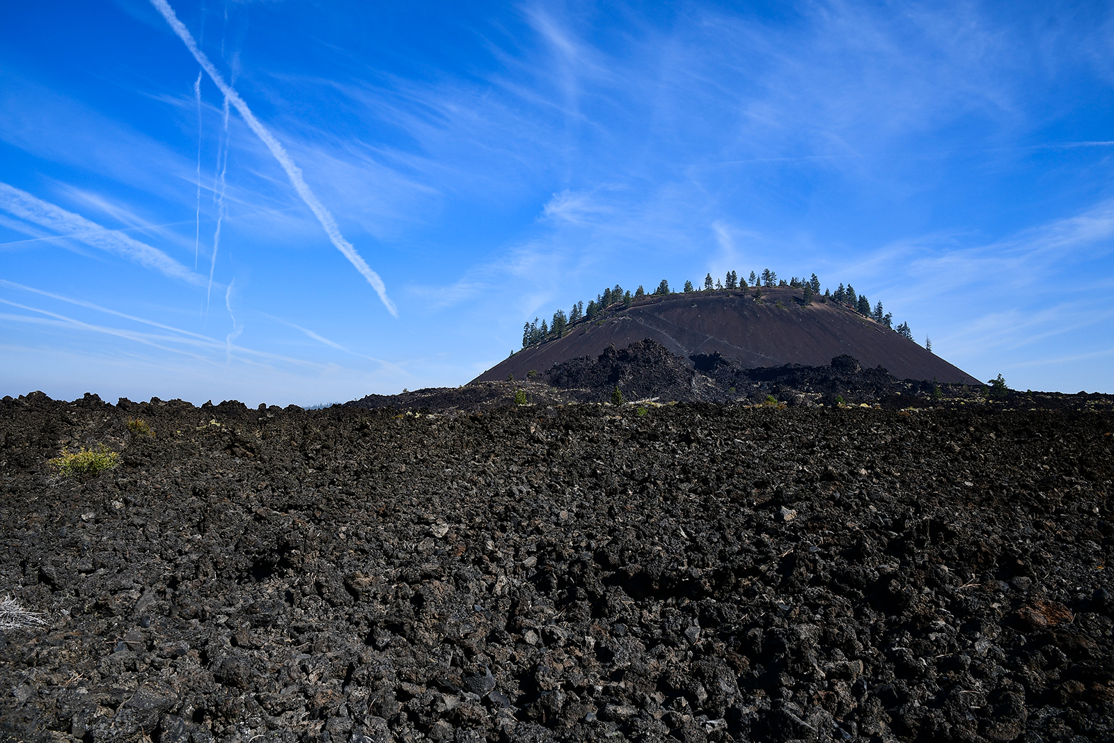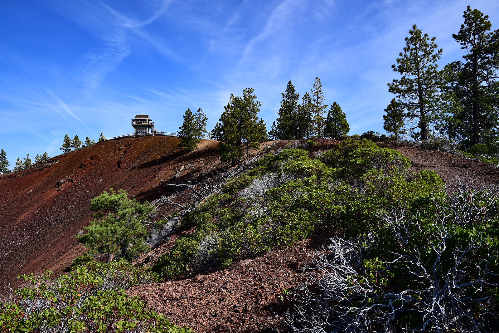 Es ist ein alter Vulkan der vor ca. 7000 Jahren mit einer gewaltigen Explosion ausgebrochen ist. Es geht nach oben. Oben angekommen blicken wir in einen tiefen Vulkankrater. Hier oben befindet sich heute eine Aussichtsstelle für Wildfeuer die hier jederzeit in den trockenen Kiefernwäldern ausbrechen können. Von hier oben kann man tief ins Land sehen. Von hier aus kann man erahnen wie heftig damals die Explosion gewesen sein muss. Heute, nach 7000 Jahren, erstreckt sich das Lava Feld bist zum Horizont – soweit das Auge reicht.