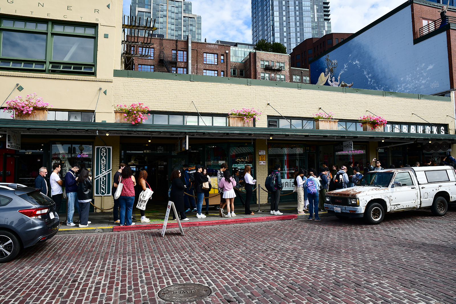 Wir verlassen das Kaugummi-Dingens und stehen plötzlich vor dem ältesten uns ersten Starbucks Kaffee der Welt. Von hier aus hat sich die Starbucks-Kette sein Weltimperium aufgebaut. Möchte man hier einen Kaffee für 10 Euro trinken, muss man viel Zeit mitbringen. Bis man dran ist können schon mal 1-2 Stunden vergehen.