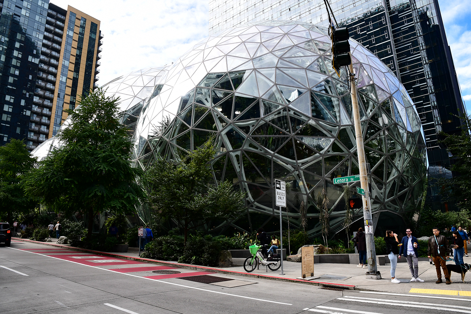 Bei unserem Rundgang kommen wir noch an „The Spheres“ vorbei. Ein futuristisches Gebäude in dem sich eine grüne Oase zum Durchatmen und Relaxen befindet. Als wir hineingehen werden wir nach unserem Amazon Ausweis gefragt. Amazon Ausweis?. Hier erfahren wir dann dass dieses Gebäude nur für Mitarbeiter von Amazon geöffnet ist. Auch das wir viel über Amazon bestellen zählt hier leider nicht – wir müssen wieder gehen. (Selten gibt es auch Öffnungen für die Proleten wie uns – aber nur selten und an bestimmten Tagen – heute ist keiner davon.)