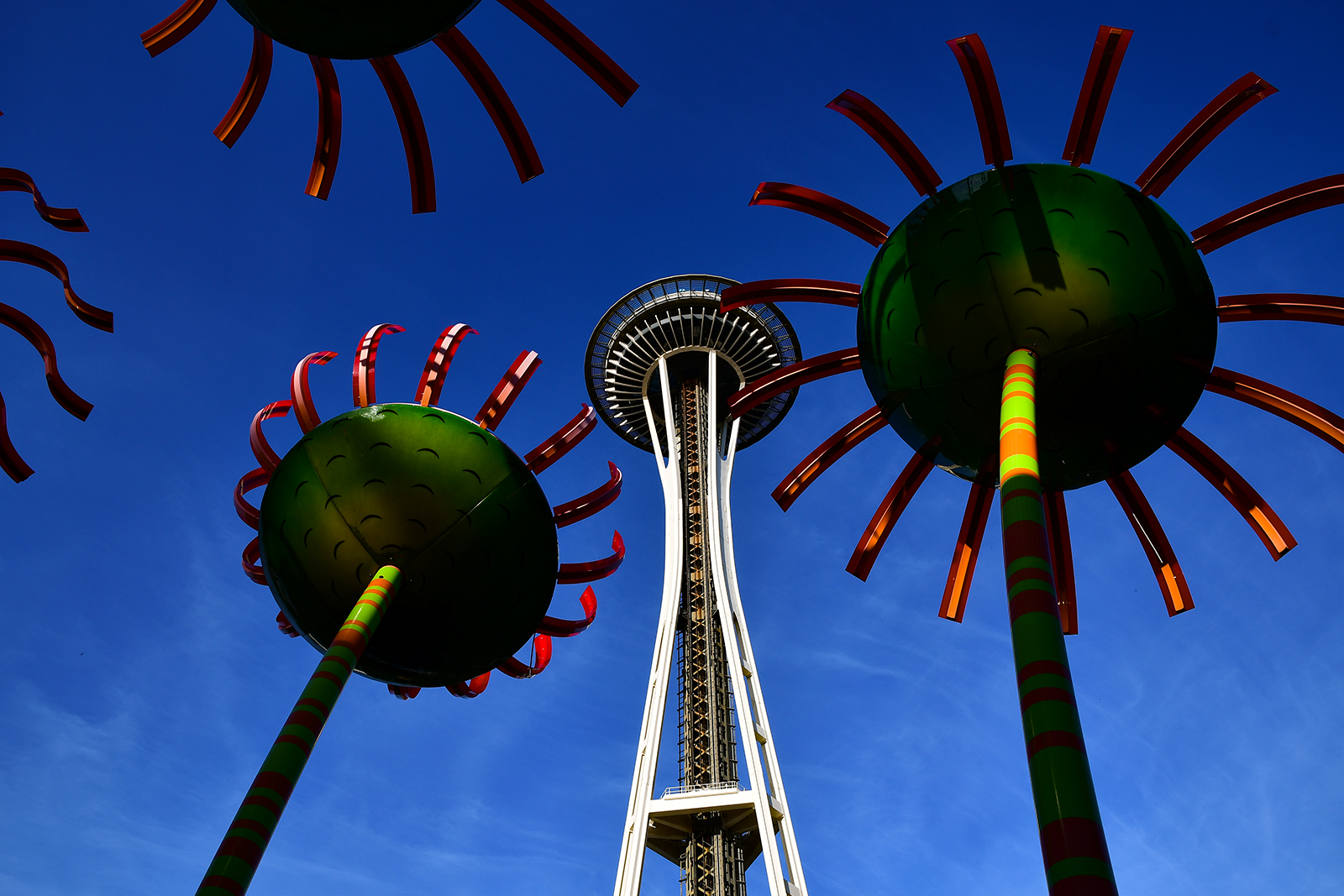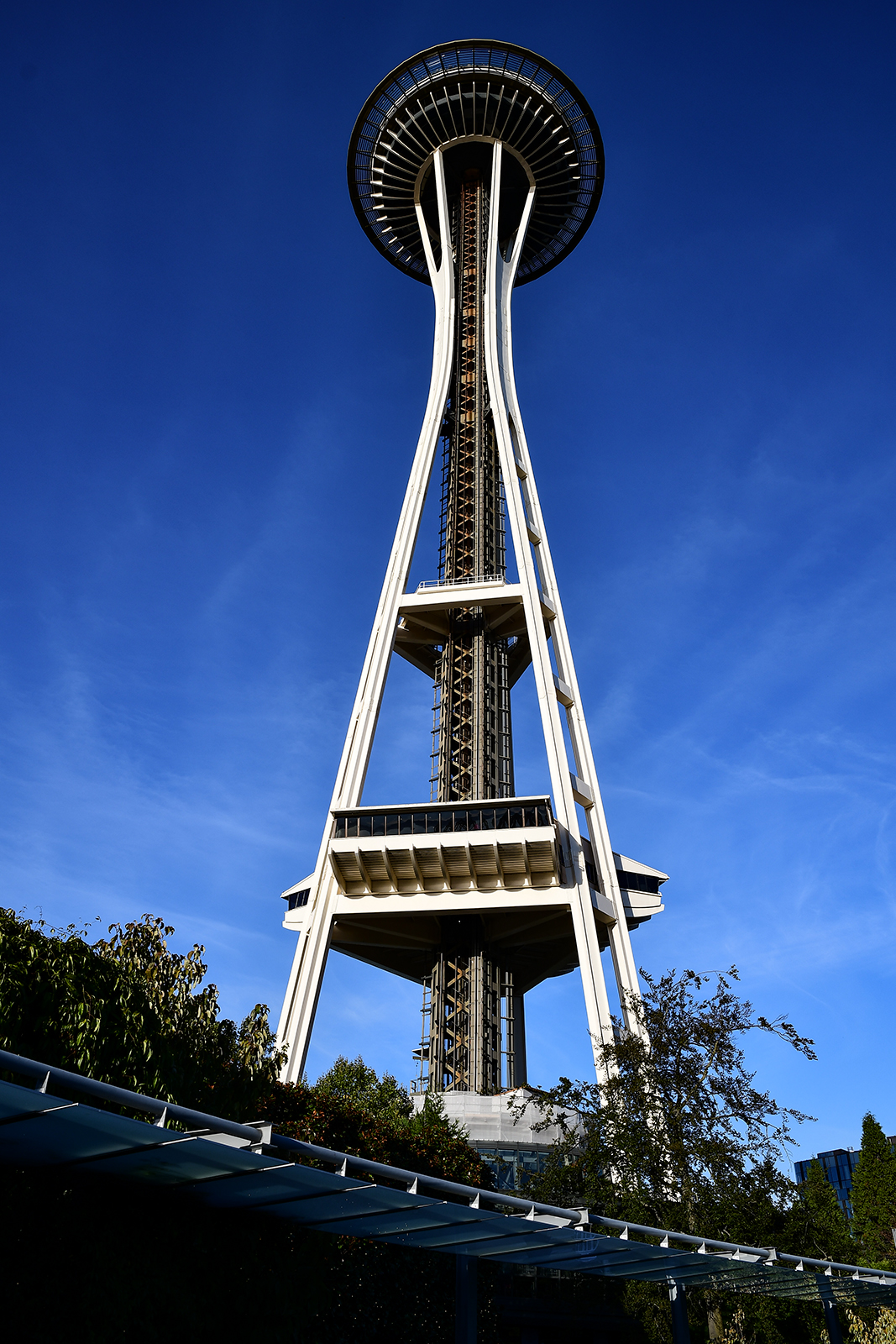 Unweit vom Kaffee entdecken wir außerirdisches Leben. Zumindest deren Transportmittel. Eine riesige NICHT-fliegende Untertasse ragt auf ihrem Landeplatz hoch in den Himmel. Wir sind am Wahrzeichen Seattles angekommen – der, die oder das „Space Needle“