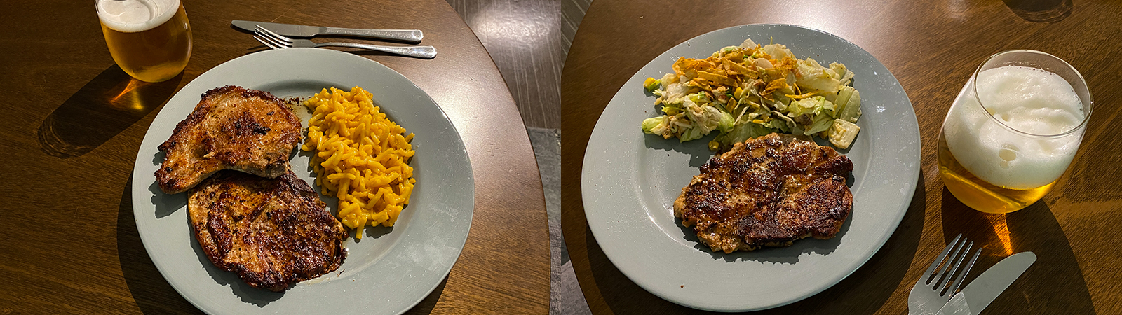 Am Abend geht es noch mal im „Schlabberlook“ in einen Supermarkt. Da wir heute zum Essen nicht mehr ausgehen wollen werden wir heute in der Wohnung selbst kochen. Es gibt Koteletts mit Mac n‘ Cheese oder mit Salat.