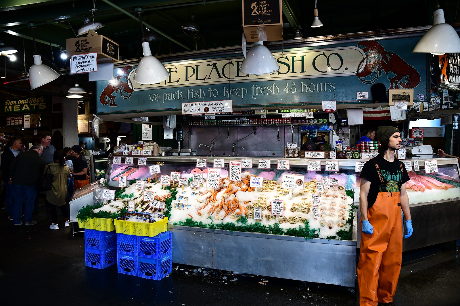 Natürlich kommen wir auch an dem durch Vollidioten-Influencer bekannten Fischstand von Seattle vorbei. Wenn hier jemand einen Fisch vorne vom Stand kauft, wirft ihn ein Mitarbeiter diesen Fisch quer durch die Halle zu dem Mitarbeiter der diesen Fisch dann verpackt. Ein für mich völlig beklopptes Touristen Schauspiel.